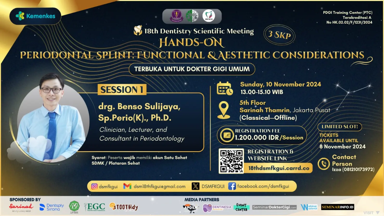 Rangkaian acara seminar dan hands-on 18th Dentistry Scientific Program Meeting 2024 ini disatukan dalam tema “Preserving Smiles for Future Generations: Leaving Legacy Through Dentistry”. Kegiatan ini diharapkan dapat menambah ilmu pengetahuan dan meningkatkan kompetensi sebagai praktisi kesehatan hingga pada akhirnya menghasilkan pelayanan yang baik dan berkualitas bagi masyarakat.