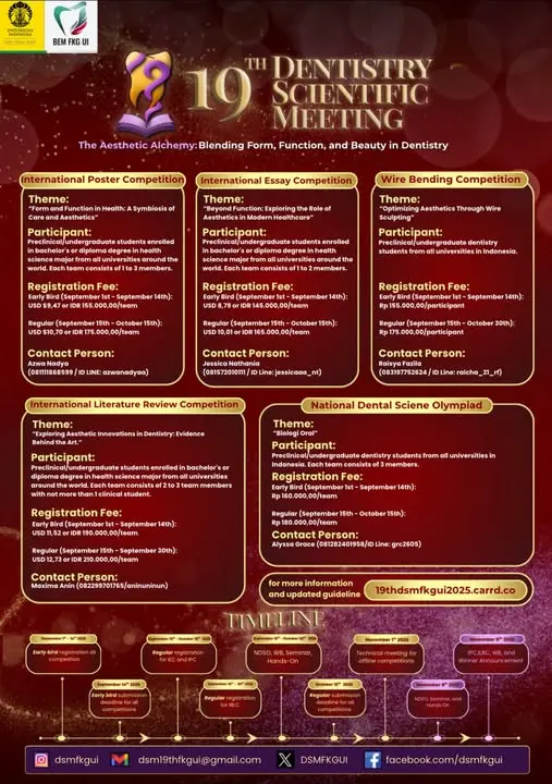 19th Dentistry Scientific Meeting (DSM) 2025 merupakan program kerja tahunan dari Badan Eksekutif Mahasiswa Fakultas Kedokteran Gigi Universitas Indonesia yang menjadi bentuk kontribusi nyata dalam dunia pendidikan kedokteran gigi di Indonesia. Salah satu rangkaian utamanya adalah seminar kedokteran gigi yang mengangkat tema “The Aesthetic Alchemy: Blending Form, Function, and Beauty in Dentistry.”
