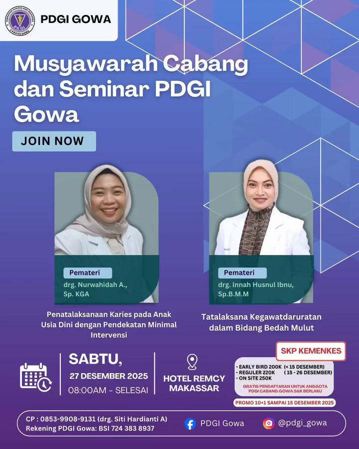 PDGI merupakan salah satu organisasi profesi yang menghimpun Dokter Gigi yang ada di seluruh Indonesia, suatu organisasi bisa berkembang dan maju jika pengurusnya diisi oleh orang-orang yang memiliki kompetesnsi dan kapabilitas serta loyalitas yang tinggi. Para pengurus PDGI hendaknya mampu mengola organisasi profesinya dengan sebaik-baiknya demi kemajuan pola pikir dan kerja para dokter gigi anggotanya. Pengurus mempunyai tanggung jawab menggerakkan roda organisasi agar berputar dan dirasakan manfaatnya oleh anggota dan masyarakat. Sehubungan dengan telah diselenggarakannya Muswil PDGI Sulselbar, maka PDGI Cabang Gowa akan menyelenggarakan Musyawarah Cabang PDGI Gowa yang akan dirangkaikan dengan seminar ilmiah dan workshop. Pelaksanaan musyawarah cabang ini sebagai tahapan untuk menjalankan roda organisasi. Sehingga setelah muscab ini akan terpilih dan terbentuk kepengurusan yang baru dan dapat melaksanakan program untuk pengembangkan profesi, salah satunya dengan membuat rapat kerja untuk merumuskan program kerja selama satu periode kepengurusan.