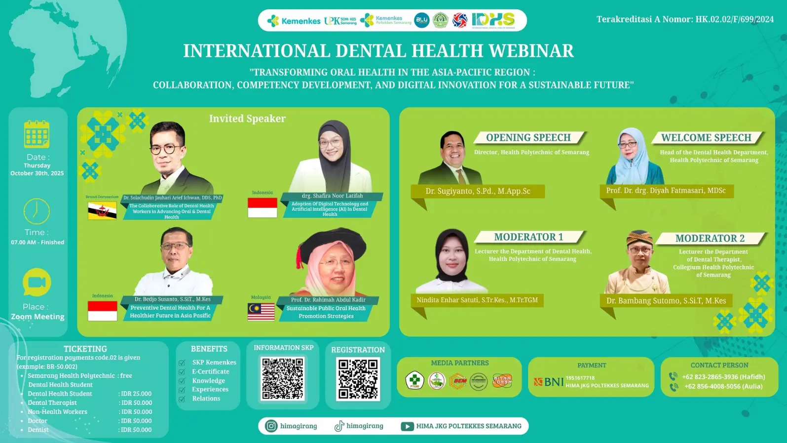 Webinar Internasional dengan tema “Transforming Oral Health in the Asia-Pacific Region: Collaboration, Competency Development, and Digital Innovation for a Sustainable Future” diselenggarakan sebagai wadah akademik dan profesional bagi para peneliti, praktisi, pembuat kebijakan, dan mahasiswa. Forum ini bertujuan untuk memperkuat kerja sama regional, menyelaraskan standar kompetensi tenaga kesehatan dengan perkembangan global, serta mendorong implementasi inovasi digital guna mendukung sistem kesehatan gigi yang tangguh, efektif, dan berkelanjutan.
