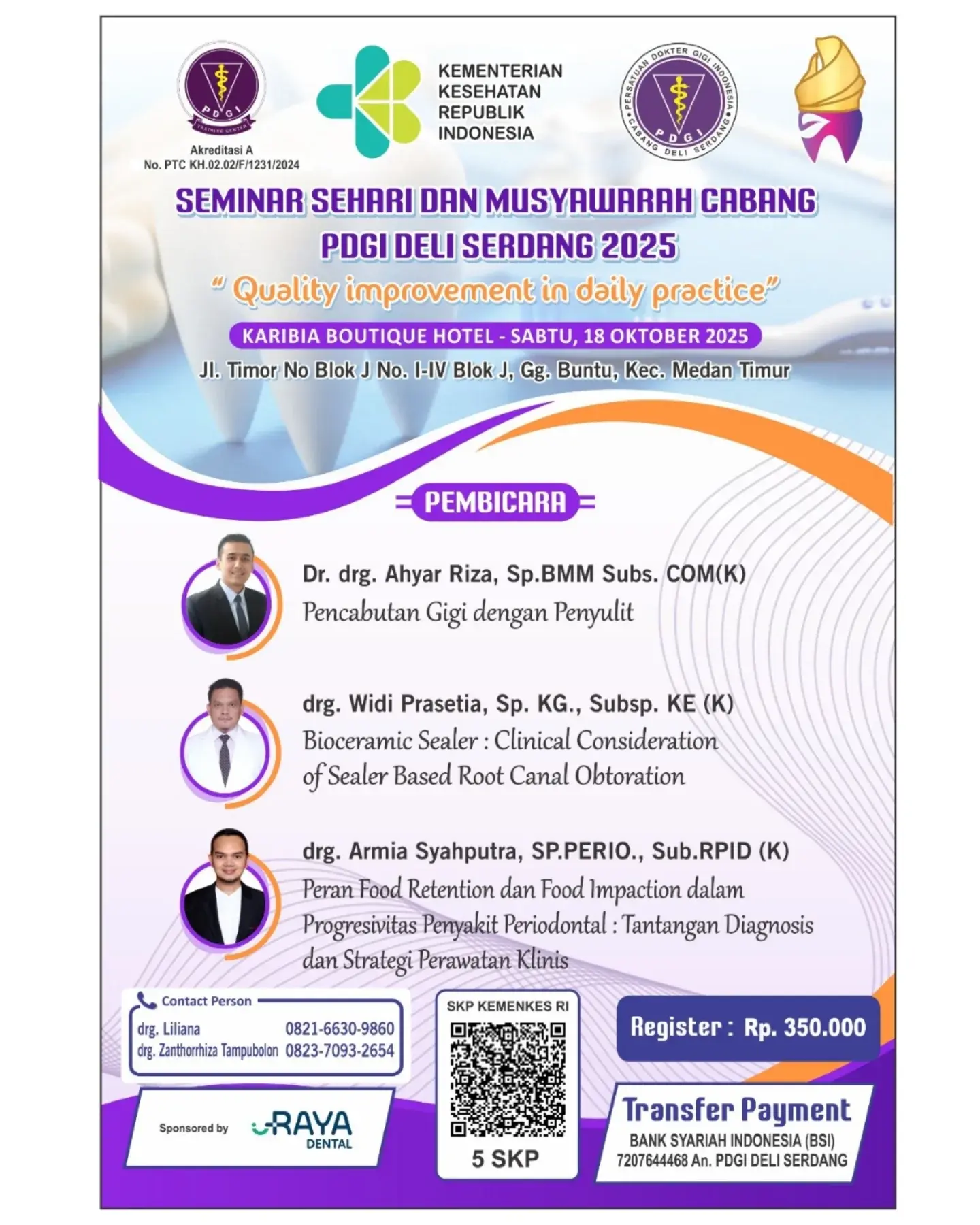 Dalam rangka menjawab kebutuhan tersebut, serta sebagai upaya untuk meningkatkan kualitas pelayanan kesehatan gigi kepada masyarakat, Persatuan Dokter Gigi Indonesia (PDGI) Cabang Deli Serdang akan menyelenggarakan kegiatan Seminar Ilmiah Sehari dengan tema “Quality improvement in daily practice”. Seminar ini akan menjadi sarana bagi para dokter gigi untuk memperbaharui wawasan ilmiah, berdiskusi mengenai tantangan dalam praktik klinis, dan memperoleh inspirasi dalam meningkatkan mutu layanan mereka.