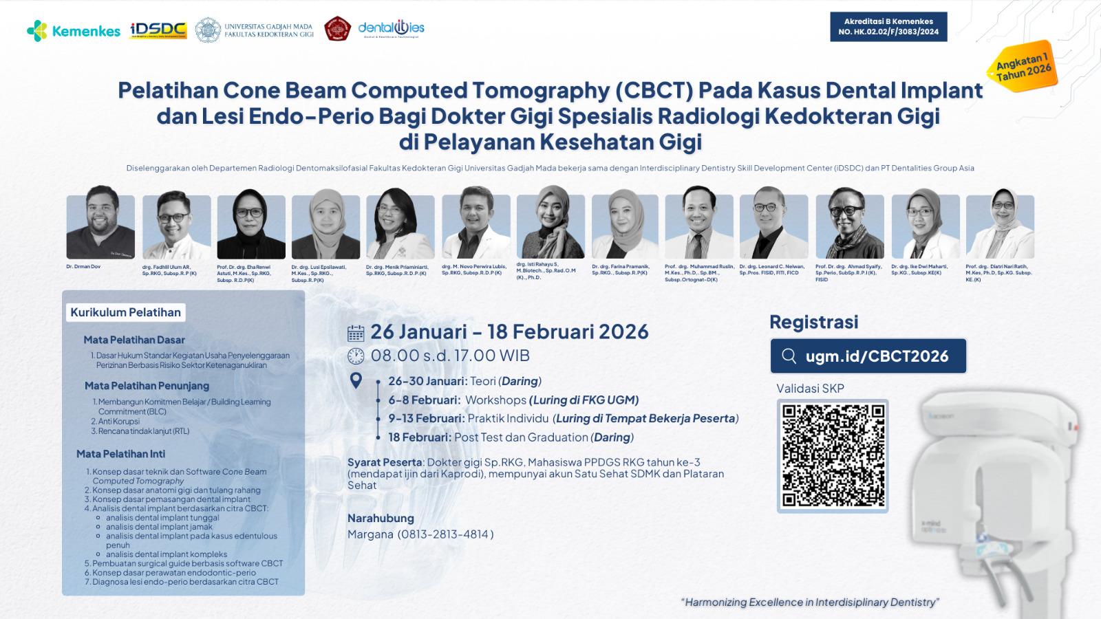 Seiring pesatnya inovasi teknologi pencitraan digital, seperti CBCT, radiologi berbasis kecerdasan buatan (Artificial Intelligence/AI), serta pemanfaatannya dalam perencanaan perawatan yang lebih presisi dan individual, penguasaan keterampilan tersebut menjadi sangat krusial. Saat ini, standar kompetensi dokter gigi spesialis Radiologi Kedokteran Gigi masih bersifat umum untuk seluruh jenis kasus. Oleh karena itu, melalui pelatihan ini peserta diharapkan mampu mengaplikasikan CBCT secara lebih spesifik, terutama pada kasus dental implant dan lesi endo-perio, dengan tetap mengedepankan kolaborasi interdisipliner agar perawatan dapat disesuaikan dengan kebutuhan masing-masing pasien.