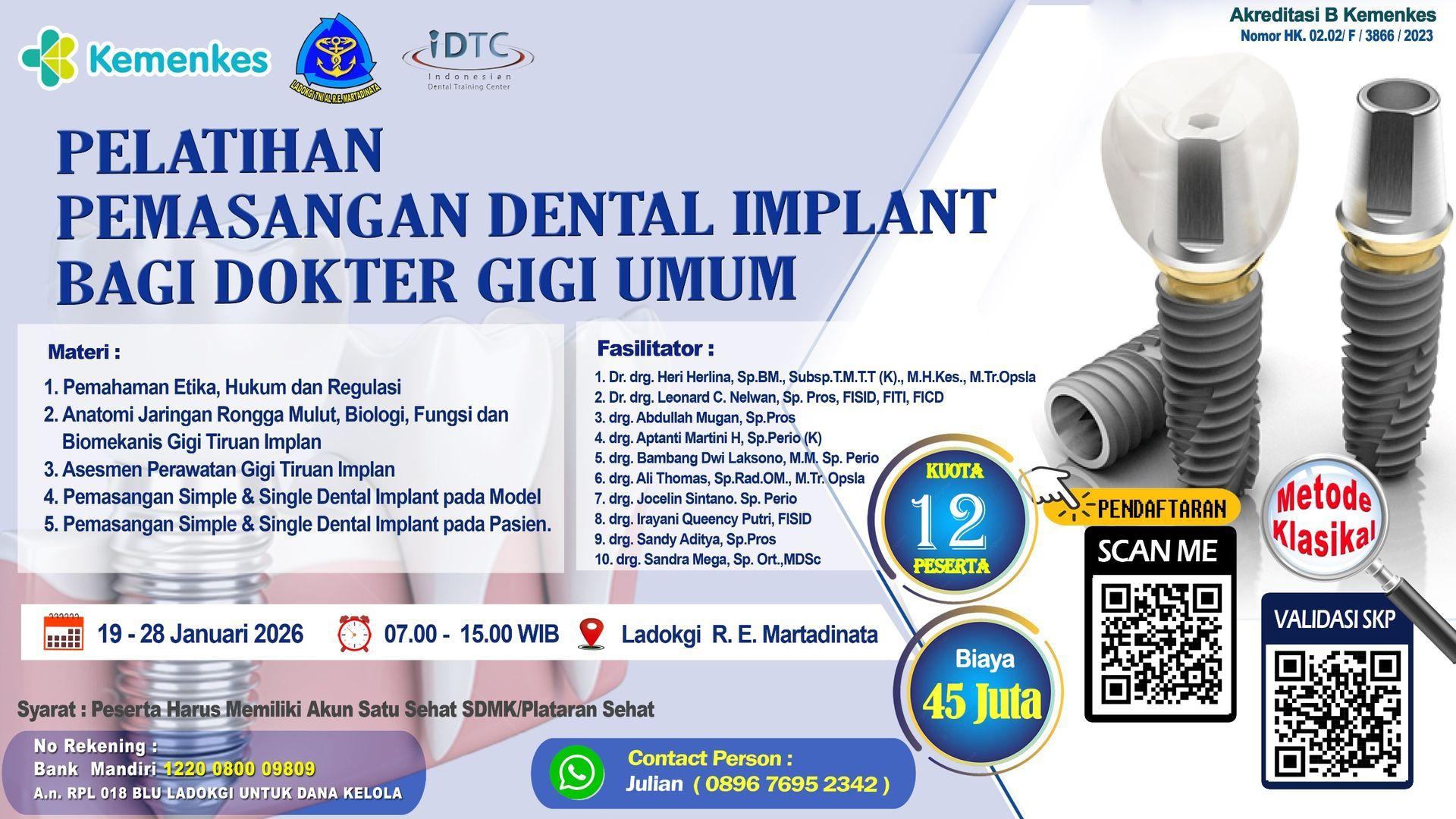 Dengan berlakunya Undang-undang Kesehatan No. 17 tahun 2023 yang mengijinkan tenaga medis asing untuk masuk dan berpraktik di Indonesia, maka dokter gigi lokal perlu meningkatkan ilmu dan keterampilannya agar mampu bersaing. Salah satu bidang yang perlu dikuasai yaitu perawatan gigi tiruan implan. Pergantian gigi dengan gigi tiruan dukungan implan merupakan salah satu perawatan yang saat ini menjadi primadona di kalangan masyarakat. Adapun keunggulannya adalah menawarkan kenyamanan yang lebih kepada pasien karena terasa seperti gigi asli, kestabilan terjaga dan estetik lebih baik.