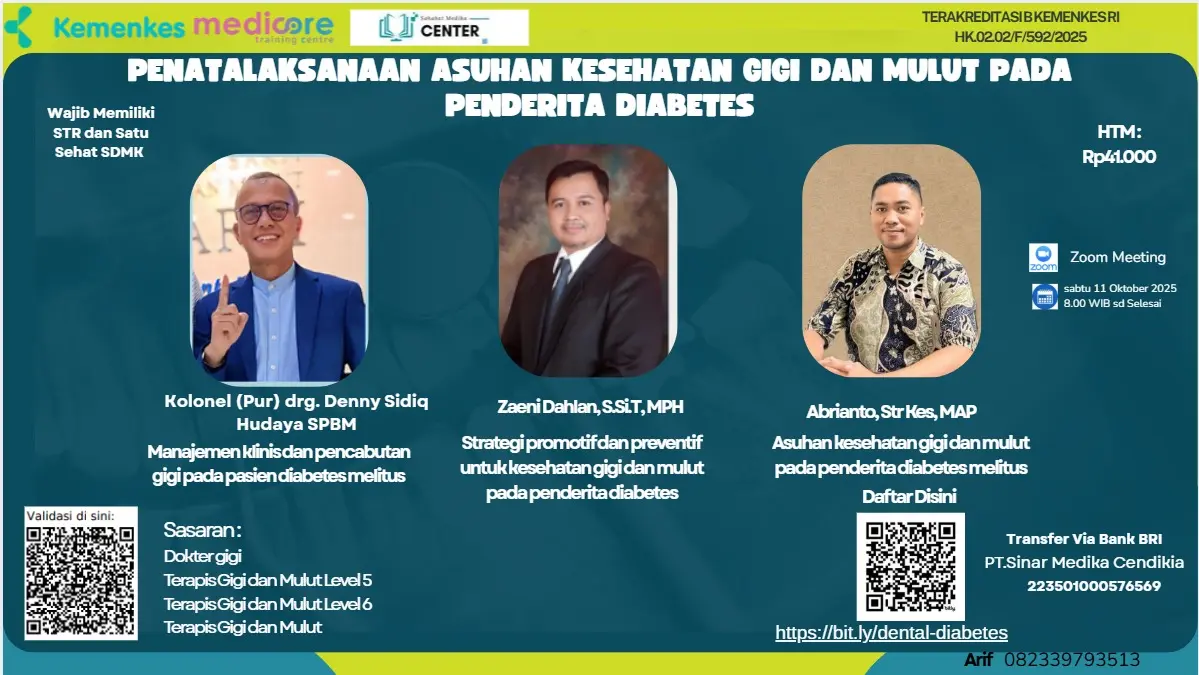 Kesehatan gigi dan mulut merupakan bagian integral dari kesehatan umum yang sering kali kurang mendapat perhatian, terutama pada penderita penyakit sistemik kronis seperti Diabetes Melitus (DM). Penderita DM memiliki risiko yang jauh lebih tinggi untuk mengalami berbagai masalah kesehatan rongga mulut, seperti penyakit periodontal (radang jaringan penyangga gigi), infeksi jamur (kandidiasis), karies gigi, xerostomia (mulut kering), serta penyembuhan luka yang lambat setelah tindakan gigi.