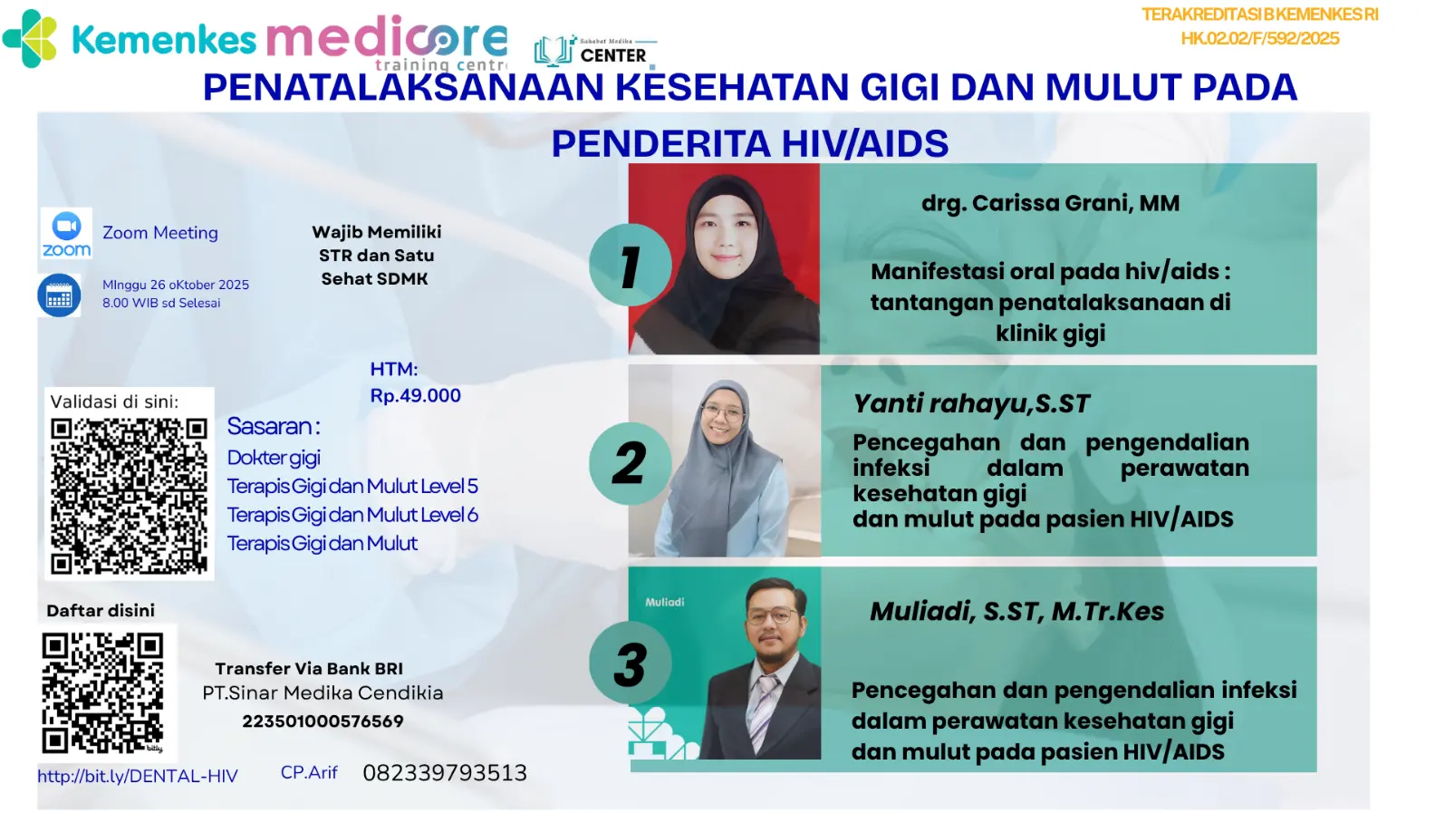 Melalui webinar ini, diharapkan para peserta dapat meningkatkan pengetahuan dan keterampilan dalam penatalaksanaan kesehatan gigi dan mulut pada penderita HIV/AIDS, serta memahami pentingnya kolaborasi multidisipliner untuk memberikan pelayanan yang holistik, aman, dan berempati.
