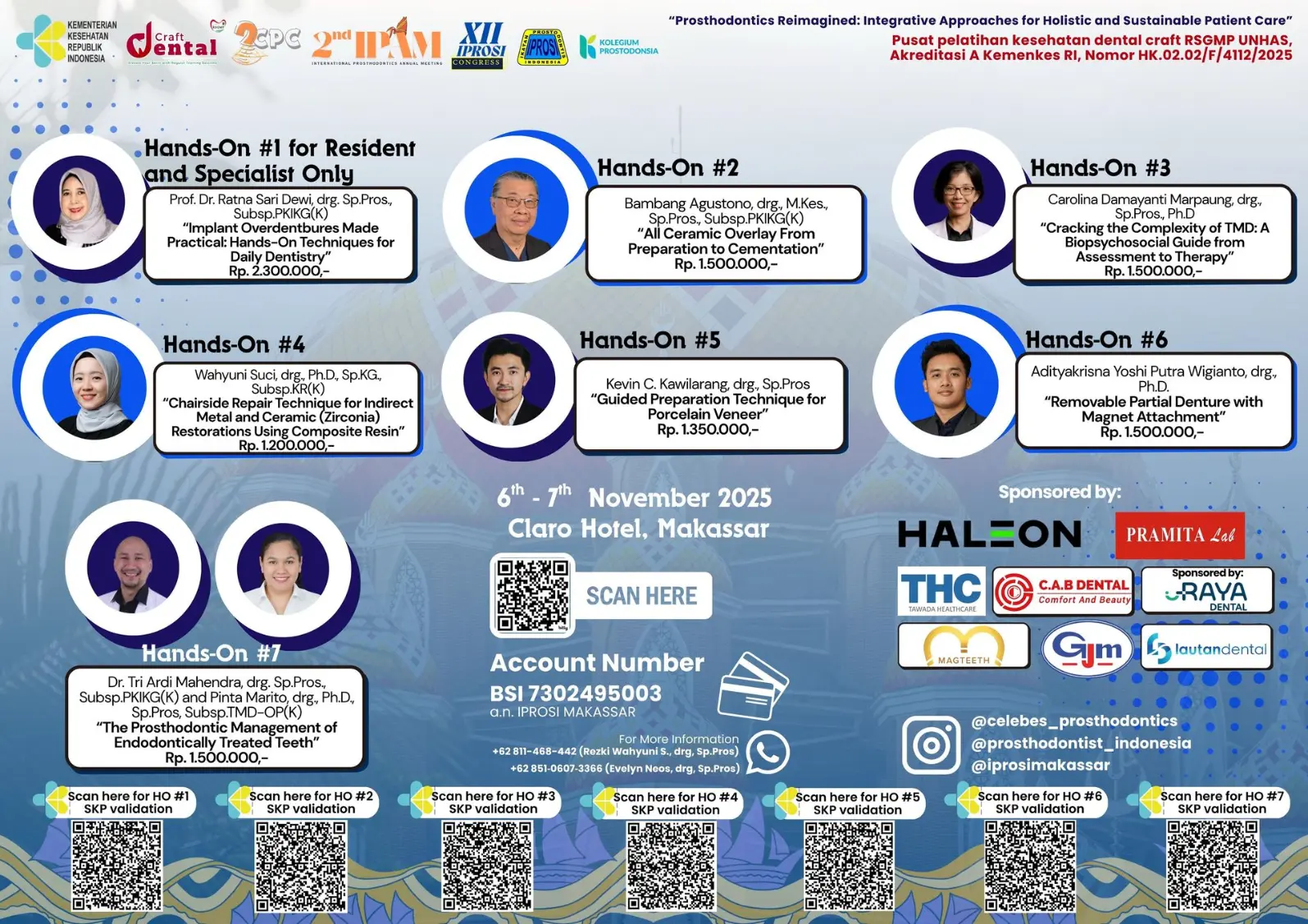 Workshop ini dirancang untuk memberikan pemahaman komprehensif mengenai prinsip kerja, indikasi, kontraindikasi, serta keuntungan dan keterbatasan penggunaan magnet attachment pada gigi tiruan sebagian lepasan. Peserta akan mempelajari jenis-jenis magnet yang digunakan dalam kedokteran gigi, mekanisme retensinya, serta pertimbangan biologis dan biomekanis yang relevan. Materi juga akan membahas perencanaan kasus berdasarkan distribusi beban kunyah, posisi abutment, serta integrasi magnet dengan desain prostesis yang optimal. Selain materi teoritis, peserta akan mendapatkan pelatihan praktis mengenai teknik klinis dan laboratorium dalam penerapan magnet attachment, mulai dari tahap pencetakan, penempatan magnet pada akar gigi atau overdenture coping, hingga tahap penyesuaian akhir RPD. Penekanan juga diberikan pada pemeliharaan jangka panjang, termasuk pembersihan magnet, evaluasi fungsi retensinya, dan tindakan apabila terjadi penurunan gaya tarik magnetik.