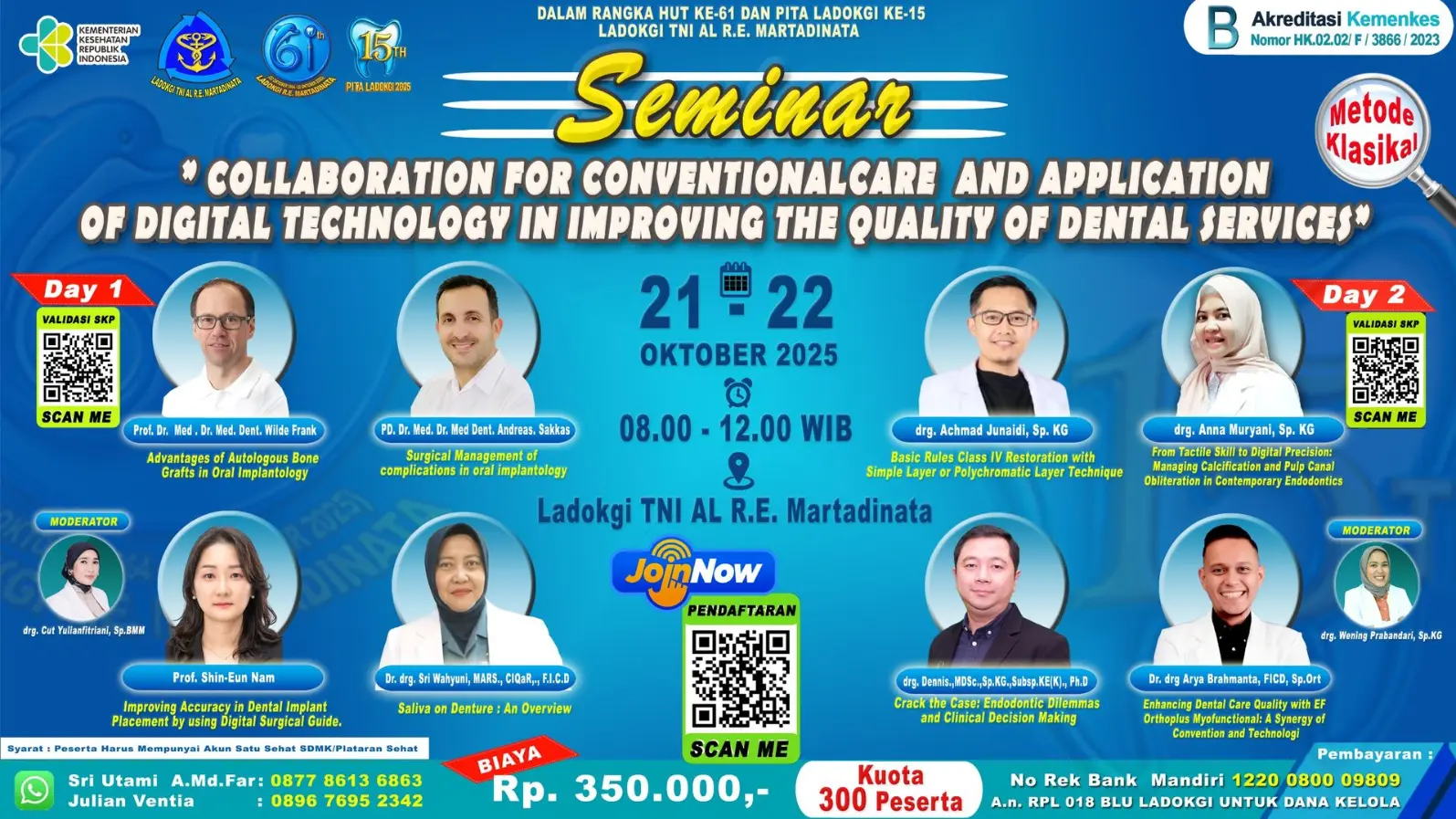 Perkembangan teknologi digital dalam dunia kesehatan terus mengalami kemajuan pesat, termasuk dalam bidang kedokteran gigi. Transformasi digital telah membawa berbagai inovasi, seperti digital radiography, intra oral scanning, 3D printing, tele dentistry, hingga penggunaan artificial intelligence dalam diagnosa dan perencanaan perawatan. Di sisi lain, praktik perawatan konvensional yang telah terbukti efektif selama bertahun-tahun tetap menjadi fondasi penting dalam pelayanan kesehatan gigi. Dalam era modern ini, tantangan utama yang dihadapi oleh tenaga kesehatan gigi adalah bagaimana menyinergikan perawatan konvensional dengan teknologi digital secara optimal. Kolaborasi antara pendekatan konvensional dan inovasi teknologi bukan hanya meningkatkan efisiensi pelayanan, tetapi juga mampu meningkatkan akurasi diagnosis, kenyamanan pasien, dan hasil perawatan yang lebih baik. Melalui seminar ini, diharapkan para peserta baik praktisi maupun akademisi, dapat memperluas wawasan mengenai pentingnya kolaborasi lintas pendekatan dalam meningkatkan mutu layanan kesehatan gigi. Selain itu, forum ini juga menjadi wadah berbagi pengetahuan dan pengalaman mengenai penerapan teknologi digital dalam praktik sehari-hari, serta tantangan dan solusi yang mungkin dihadapi. Seminar ini menjadi langkah strategis dalam mendorong integrasi teknologi dalam pelayanan kesehatan gigi yang tetap berpijak pada prinsip-prinsip etika, keselamatan pasien, dan kualitas layanan. Diharapkan kegiatan ini mampu memberikan kontribusi nyata terhadap peningkatan standar pelayanan kedokteran gigi di Indonesia maupun secara global. Ladokgi REM sebagai fasilitas kesehatan TNI Angkatan Laut mempunyai hari bersejarah pada setiap tanggal 22 Oktober, yaitu peringatan hari ulang tahun. Melalui peringatan hari ulang tahun Ladokgi REM yang ke-61 Tahun 2025 ini diharapkan dapat menumbuhkan semangat kekeluargaan dan kebersamaan agar tercipta suasana yang kondusif dalam upaya meningkatkan kinerja dan tercapainya pelaksanaan tugas pokok sesuai yang diharapkan. Ladokgi REM sebagai Lembaga Kedokteran Gigi yang memiliki tugas pokok yang terdiri dari unsur Pendidikan dan Pelatihan, Penelitian dan Pengembangan serta Pelayanan. Dalam tupoksinya mengadakan pendidikan dan pelatihan dokter gigi, peningkatan pengetahuan sumber daya manusia tenaga medis dan tenaga paramedis dengan kegiatan ilmiah yang dapat memberikan peningkatan mutu sumber daya manusia. Setiap dokter gigi perlu untuk selalu meningkatkan pengetahuan dan wawasannya agar dapat memberikan pelayanan yang terbaik kepada para pasiennya. Dalam upaya tersebut dan dalam rangka menyambut Hari Ulang Tahun, Ladokgi REM akan menyelenggarakan kegiatan Pekan Ilmiah Tahunan (PITA) Ladokgi ke-15 dengan tema "Collaboration for Conventional Care and Application of Digital Technology in Improving The Quality of Dental Services".