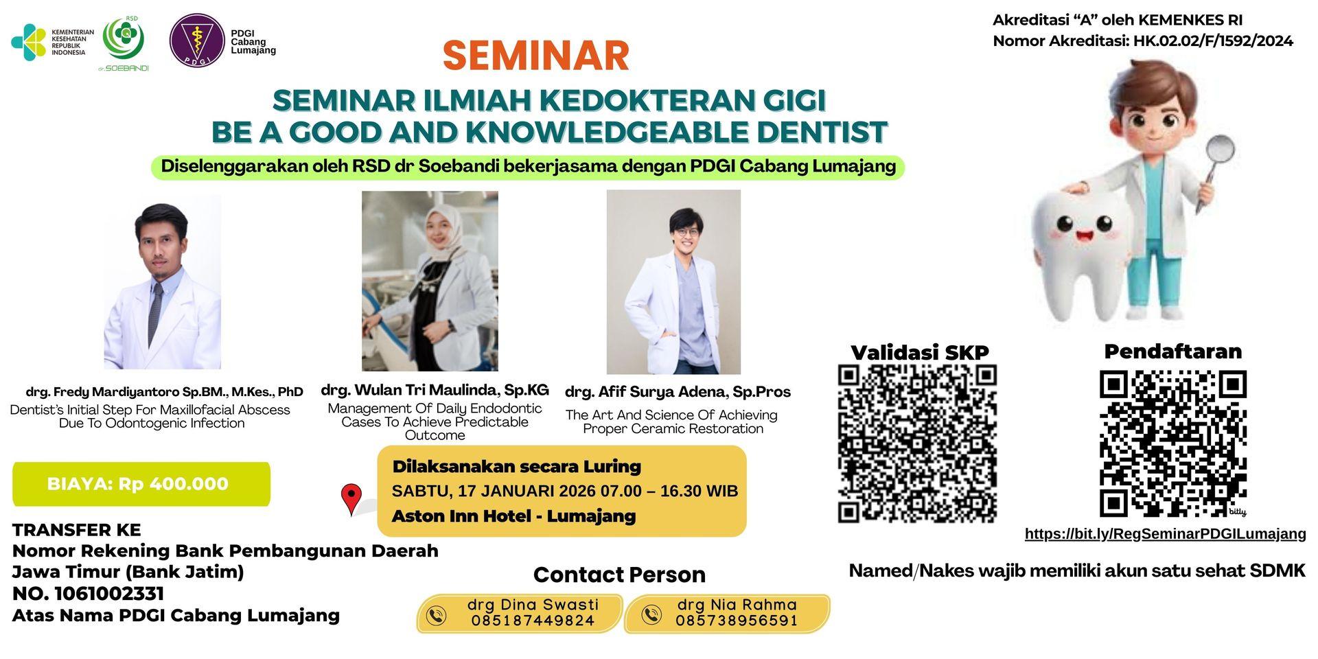 Perkembangan ilmu kedokteran gigi saat ini menuntut para praktisi untuk memiliki pengetahuan dan keterampilan yang komprehensif, mulai dari diagnosis penyakit rongga mulut hingga rehabilitasi fungsi dan estetik gigi. Tiga aspek penting dalam praktik kedokteran gigi meliputi infeksi rongga mulut, perawatan saluran akar gigi, dan restorasi tetap. Melalui seminar ilmiah ini, peserta diharapkan memahami hubungan antara ketiga aspek tersebut dalam satu rangkaian perawatan gigi yang holistik — mulai dari pencegahan dan perawatan infeksi hingga restorasi fungsional dan estetik yang optimal.