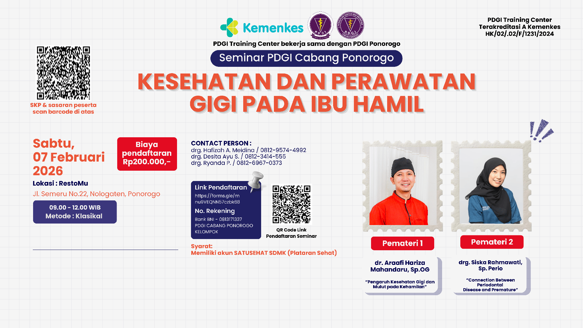 Berdasarkan hal tersebut, seminar kedokteran gigi dengan tema “Kesehatan dan Perawatan Gigi pada Ibu Hamil” diselenggarakan sebagai wadah edukasi dan diskusi ilmiah. Seminar ini diharapkan dapat memberikan pengetahuan terkini mengenai perubahan kesehatan gigi selama kehamilan, pencegahan serta penatalaksanaan masalah gigi dan mulut, serta pentingnya peran dokter gigi dalam mendukung kesehatan ibu dan janin. Dengan adanya kegiatan ini, diharapkan tercipta peningkatan kualitas pelayanan dan kesadaran akan pentingnya kesehatan gigi dan mulut selama masa kehamilan.