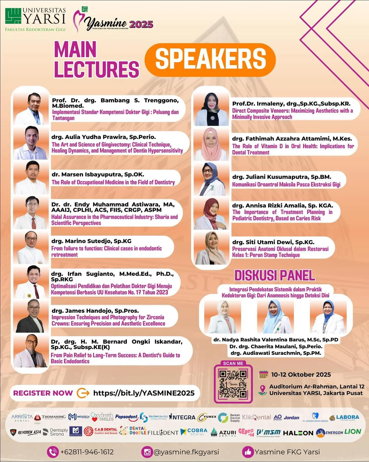 Disrupsi teknologi di era milenial sangat berpengaruh dalam perkembangan ilmu dan teknologi di bidang kedokteran gigi. Tantangan ini membuat, dokter gigi Indonesia harus mampu bersaing dan mengembangkan diri dalam memberikan pelayanan terbaik dengan keamanan yang paripurna bagi pasien. Fakultas Kedokteran Gigi Universitas YARSI saat ini genap 13 Tahun. Fakultas Kedokteran Gigi (FKG) Universitas YARSI, sejak didirikan pada tahun 2012 turut berpartisipasi dalam memberikan pengajaran akademik, turut terlibat dalam penelitian dan pengabdian masyarakat dalam menghasilkan dokter gigi muslim yang unggul dan menuju Institusi “Center of Excellence”. HUT FKG Universitas YARSI yang ke 13, akan dilaksanakan beberapa kegiatan ilmiah di bidang ilmu pengetahuan dan teknologi kedokteran gigi dengan skala nasional dengan menghadirkan pakar-pakar kedokteran gigi dari mitra yang bekerja sama pada kegiatan YARSI Scientific Meetings and Exhibition (YASMINE) 2025. YASMINE 2025 merupakan Komitmen FKG Universitas YARSI sebagai institusi pendidikan kedokteran gigi yaitu melakukan upaya pendidikan kedokteran gigi berkelanjutan (Continuing Dental Education) bagi lulusan dokter gigi yang profesional dan turut ambil bagian dalam menyehatkan kehidupan bangsa.