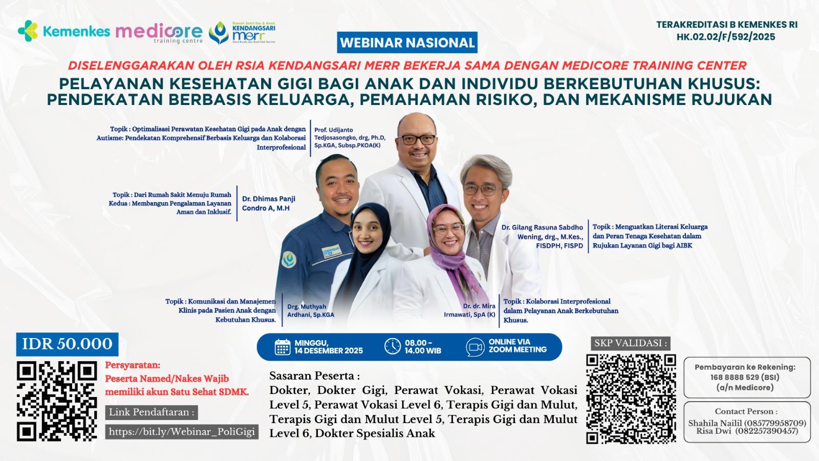 Namun, keberhasilan klinis hanya akan berkelanjutan jika upaya mengedukasi dokter gigi FKTP, TPMDG, hingga Dokter Gigi Spesialis Kedokteran Gigi Anak berlangsung komprehensif dan terstruktur. Disamping itu juga diperlukan upaya menjalin kepercayaan komunitas orang tua ABK serta membangun jejaring rujukan berbasis data dari dan ke fasilitas rujukan spesialistik. Berdasarkan latar belakang ini, maka diperlukan upaya edukasi digital melalui webinar yang akan diselenggarakan oleh RSIA Kendangsari Merr untuk para tenaga kesehatan terkait.