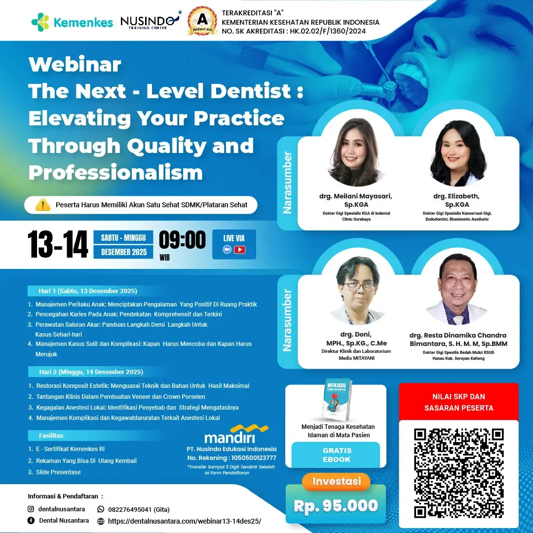 Kemajuan ilmu pengetahuan, teknologi, serta meningkatnya kesadaran masyarakat akan pentingnya kesehatan gigi dan mulut. Pasien tidak hanya menuntut perawatan yang tepat dan akurat secara medis, tetapi juga menginginkan pelayanan yang berkualitas, nyaman, serta ditunjang dengan sikap profesional dari tenaga kesehatan gigi. Hal ini menjadikan dokter gigi dituntut untuk terus meningkatkan kompetensi dan standar praktiknya agar mampu memenuhi ekspektasi yang semakin tinggi. Di tengah persaingan yang semakin ketat, kualitas layanan dan profesionalisme menjadi faktor penentu keberhasilan sebuah praktik kedokteran gigi. Dokter gigi tidak cukup hanya memiliki keterampilan klinis, tetapi juga harus memahami pentingnya manajemen pelayanan, komunikasi yang efektif dengan pasien, serta penerapan etika profesi dalam setiap tindakan. Profesionalisme yang terjaga dengan baik tidak hanya meningkatkan kepercayaan pasien, tetapi juga menciptakan reputasi positif yang berkesinambungan bagi praktik kedokteran gigi. Seminar “The Next-Level Dentist: Elevating Your Practice Through Quality and Professionalism” diselenggarakan untuk menjawab kebutuhan tersebut, dengan menghadirkan pembahasan komprehensif mengenai strategi peningkatan kualitas layanan serta penguatan profesionalisme dalam praktik kedokteran gigi. Melalui seminar ini, peserta akan mendapatkan wawasan dan keterampilan baru untuk mengembangkan diri sekaligus meningkatkan mutu layanan klinis yang mereka berikan.