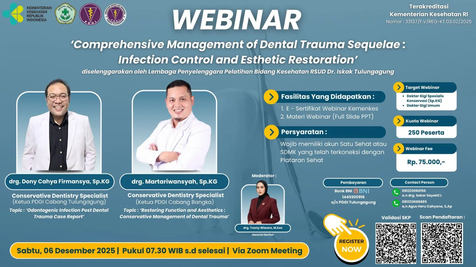 Webinar ini dirancang untuk memperbarui pengetahuan dan keterampilan dokter gigi mengenai protokol penanganan trauma gigi. Kami akan mengupas tuntas diagnosis, klasifikasi, serta berbagai teknik endodontik mutakhir yang dapat diterapkan. Selain itu, webinar ini juga akan membahas strategi efektif dalam pencegahan dan penanganan infeksi sekunder pasca-trauma, sehingga dokter gigi dapat memberikan perawatan terbaik dan meningkatkan prognosis jangka panjang gigi pasien.