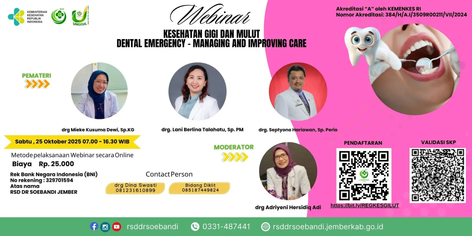 Oleh karena itu, kasus dental emergency memerlukan penanganan secara cepat dan tepat oleh tenaga medis di tiap fasilitas kesehatan. RSD dr. Soebandi sebagai salah satu RS pemerintah di Kabupaten Jember yang dilengkapi fasilitas Klinik Gigi dan Mulut dengan 6 (enam) SDM dokter gigi spesialis, memiliki tanggung jawab turut andil memberikan pelayanan kesehatan terbaik bagi masyarakat, utamanya pada upaya kuratif. Berdasarkan hal tersebut, RSD dr. Soebandi mengadakan acara Webinar Medis Kolaborasi dengan tema “Dental Emergency – Managing and Improving Care”.