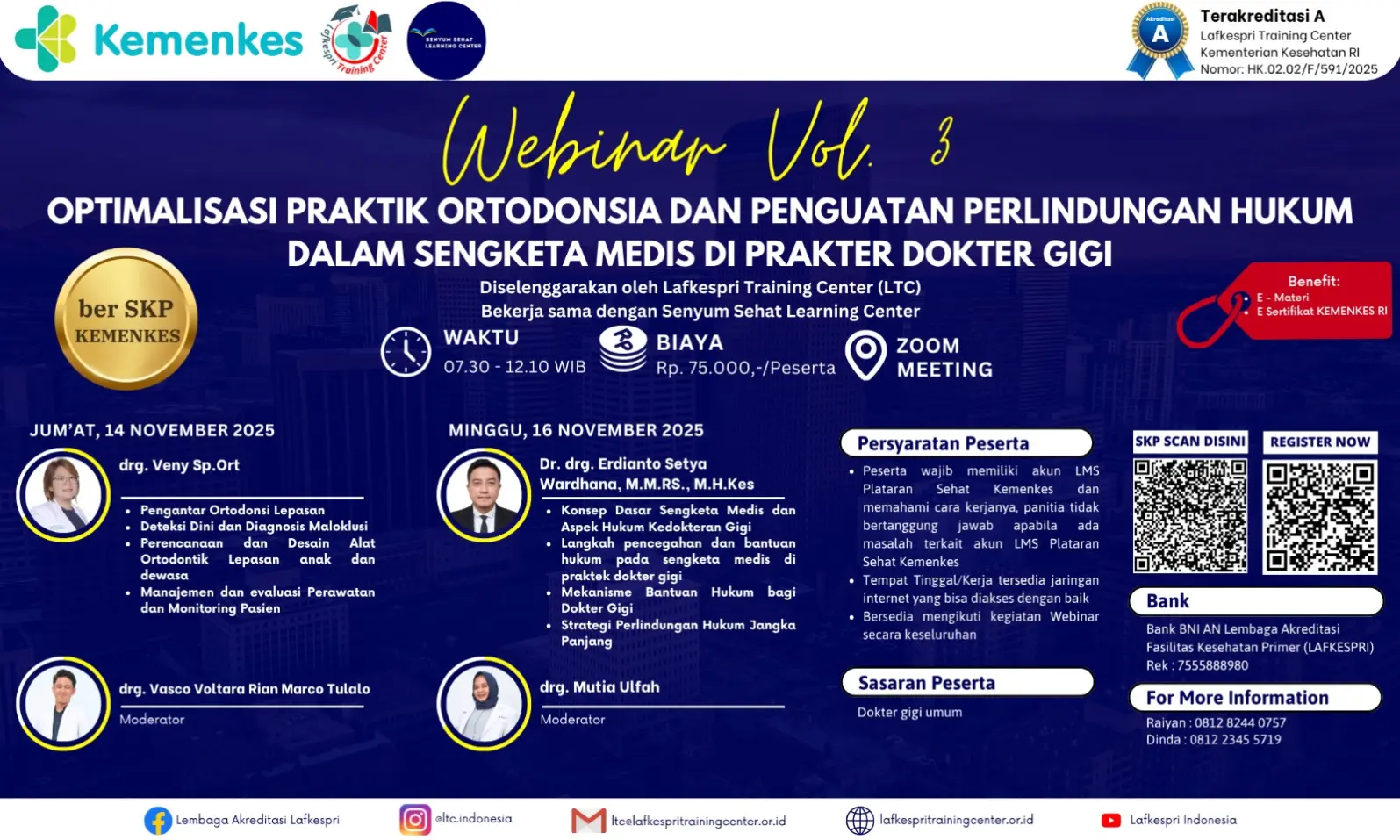 Webinar ini diselenggarakan sebagai sarana edukatif untukmemperkuat kapasitas dokter gigi dalam menjalankan praktikortodonsia secara profesional, beretika, dan sesuai ketentuan hukum sehingga mampu melindungi diri dari potensi sengketa sekaligusmeningkatkan mutu pelayanan kepada pasien.