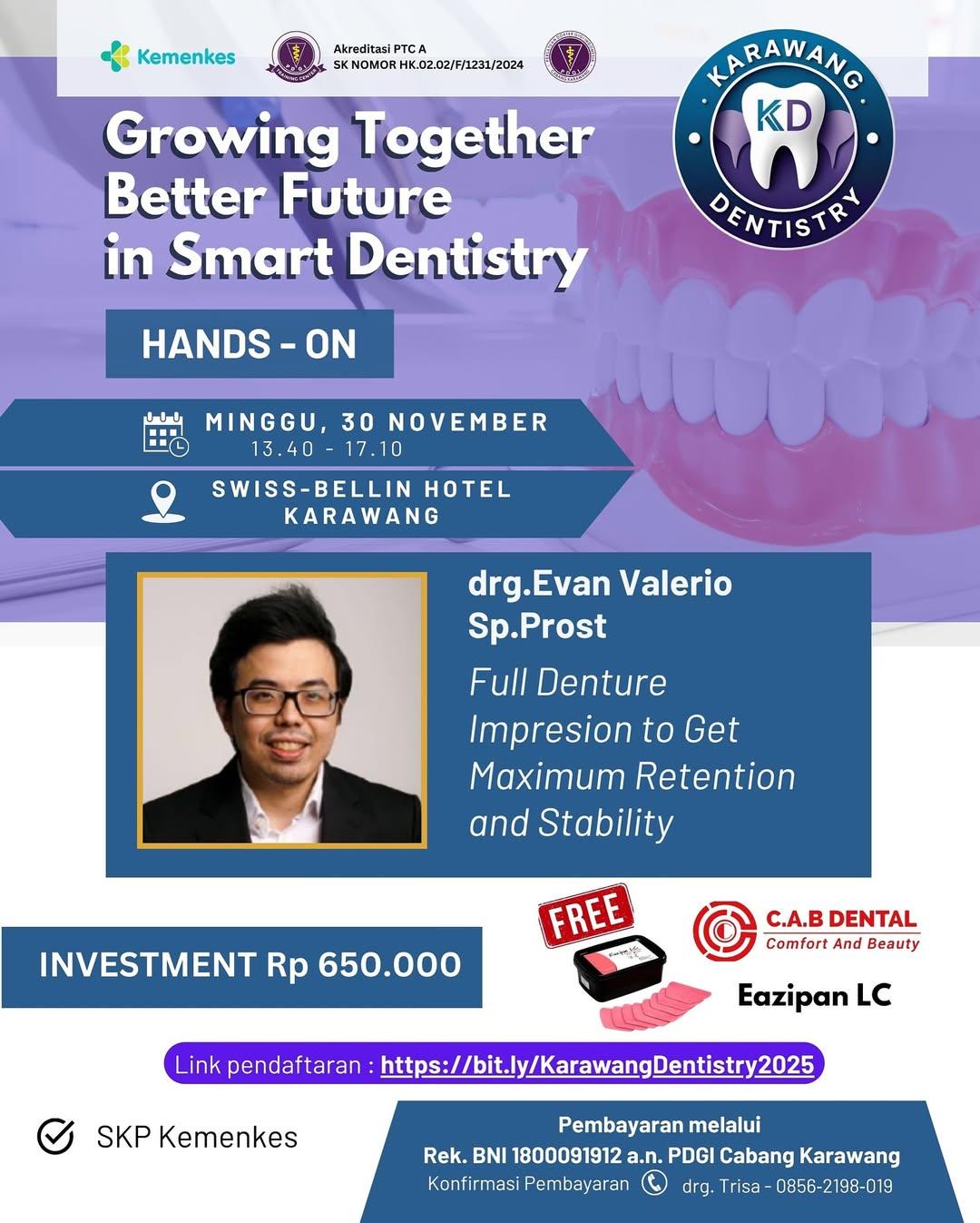 Dokter Gigi di Kabupaten Karawang khususnya secara sadar dan akan terus meningkatkan kemampuan dan mutu layanan kesehatannya dengan mengikuti pendidikan atau pelatihan kedokteran gigi yang berkelanjutan dalam rangka memahami perkembangan ilmu pengetahuan dan teknologi kedokteran gigi yang sesuai dengan standar pendidikan profesi. PDGI Kabupaten Karawang sebagai organisasi profesi yang menaungi seluruh Dokter Gigi di wilayah Kabupaten Karawang bermaksud menyelenggarakan suatu kegiatan Seminar Ilmiah Kegiatan ini dikemas dengan konsep acara Seminar Ilmiah dan Workshop untuk memfasilitasi kebutuhan Dokter Gigi akan perkembangan ilmu pengetahuan secara cepat.