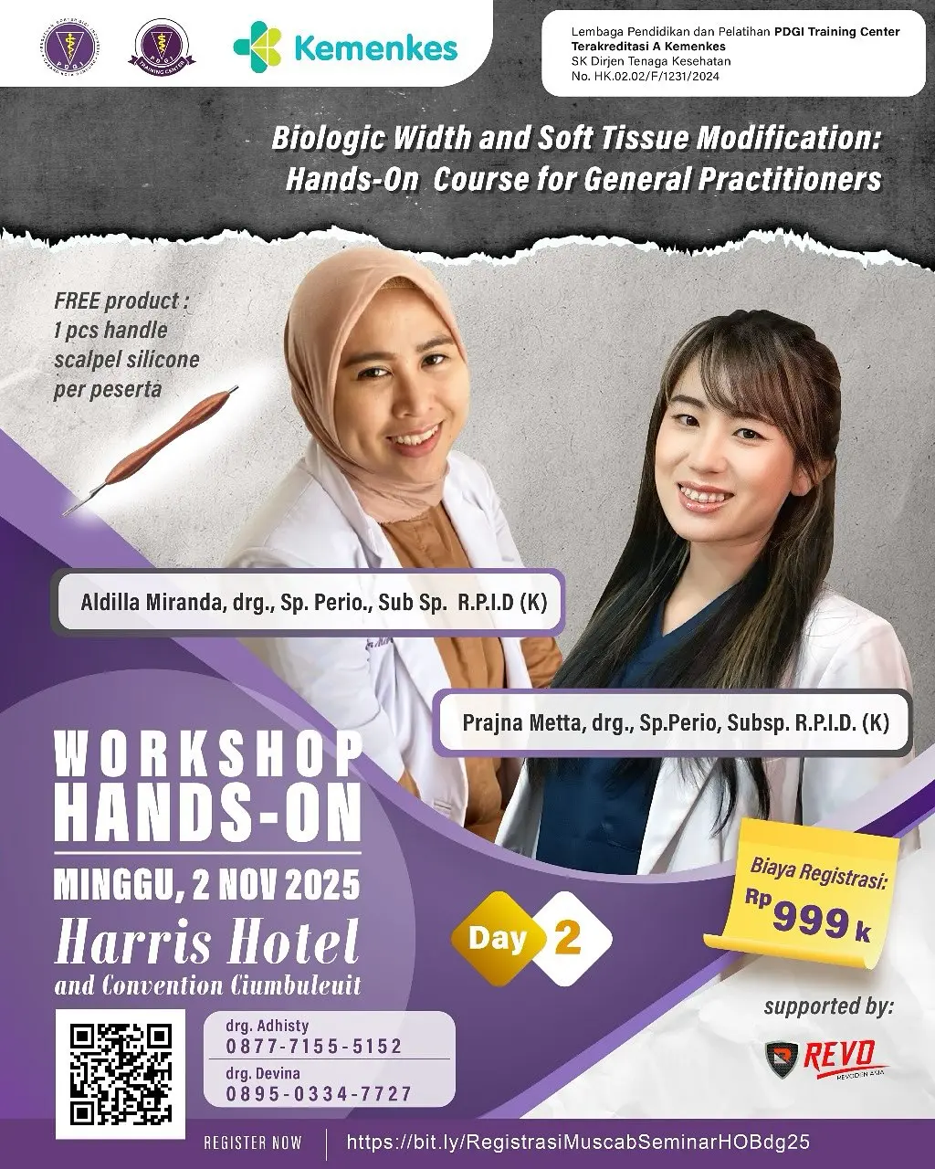Workshop “Biologic Width and Soft Tissue Modification: Hands-On Course for General Practitioners” diselenggarakan untuk membekali dokter gigi dengan pemahaman teoritis dan keterampilan praktis dalam mempertahankan ruang biologis serta melakukan modifikasi jaringan lunak secara aman dan efektif. Dengan pelatihan langsung (hands-on), peserta diharapkan dapat menerapkan prinsip-prinsip ini dalam praktik klinis guna meningkatkan hasil perawatan yang fungsional, sehat, dan estetis.