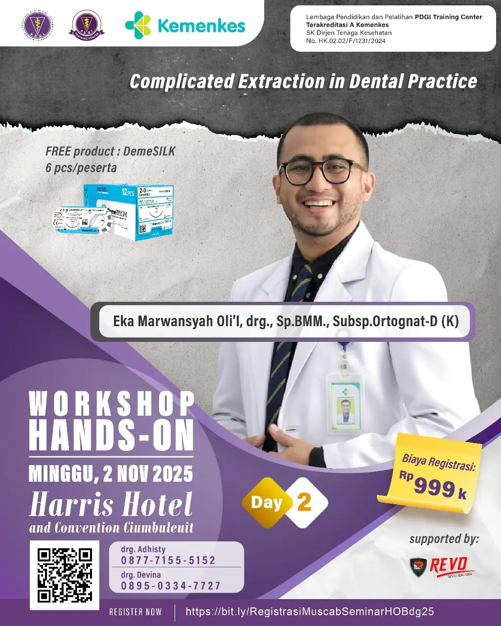 Workshop “Complicated Extraction in Dental Practice” diselenggarakan untuk memberikan pembekalan menyeluruh kepada dokter gigi dalam mengenali, merencanakan, dan melakukan pencabutan gigi yang rumit secara aman, efisien, dan sesuai standar. Melalui kombinasi materi teori dan praktik langsung, diharapkan peserta mampu meningkatkan kompetensinya dalam menangani kasus pencabutan kompleks dengan meminimalkan risiko komplikasi serta meningkatkan kualitas pelayanan kepada pasien.