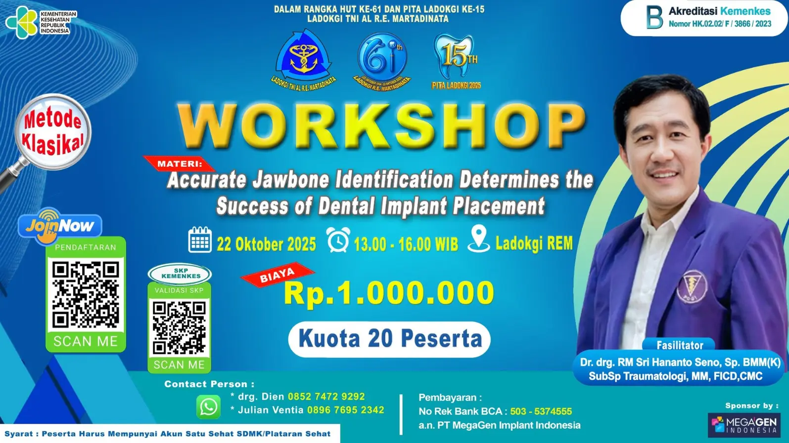 Dalam bidang kedokteran gigi, terutama dalam praktik implantologi, keberhasilan pemasangan implan sangat dipengaruhi oleh ketepatan dalam mengidentifikasi struktur anatomi tulang rahang. Kesalahan dalam analisis atau penilaian terhadap kondisi tulang rahang dapat menyebabkan komplikasi serius, seperti kegagalan osseointegrasi, cedera saraf, perforasi sinus maksilaris, hingga infeksi pasca-operasi. Perkembangan teknologi diagnostik seperti radiografi digital, CT scan, hingga CBCT (Cone Beam Computed Tomography) memungkinkan identifikasi struktur tulang rahang menjadi lebih akurat. Namun, penggunaan teknologi ini harus disertai dengan pemahaman yang kuat terhadap anatomi dan interpretasi citra radiografis. Workshop ini diselenggarakan untuk meningkatkan kompetensi dokter gigi, terutama dalam melakukan identifikasi anatomi tulang rahang secara akurat, perencanaan penempatan implan yang tepat, serta mengurangi risiko kesalahan klinis yang dapat merugikan pasien. Melalui kegiatan ini, diharapkan para peserta dapat memahami pentingnya evaluasi awal tulang rahang sebagai kunci utama keberhasilan tindakan implan gigi.