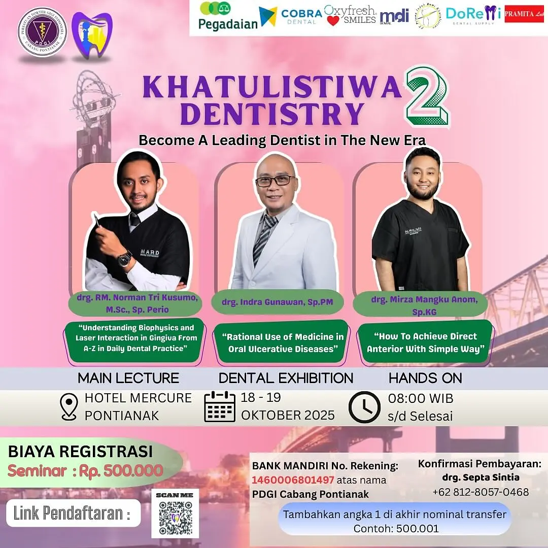 Bergerak dari dasar pemikiran diatas kami dari Profesi Kedokteran Gigi dalam rangka meningkatkan profesionalisme di bidang kedokteran gigi, maka PDGI Cabang Pontianak mengadakan kegiatan Workshop dalam acara Khatulistiwa Dentistry 2025 yang melibatkan seluruh profesi dan stakeholder yang terkait dalam pelayanan kesehatan gigi secara nasional dengan mengusung judul “Diastema Closure”.