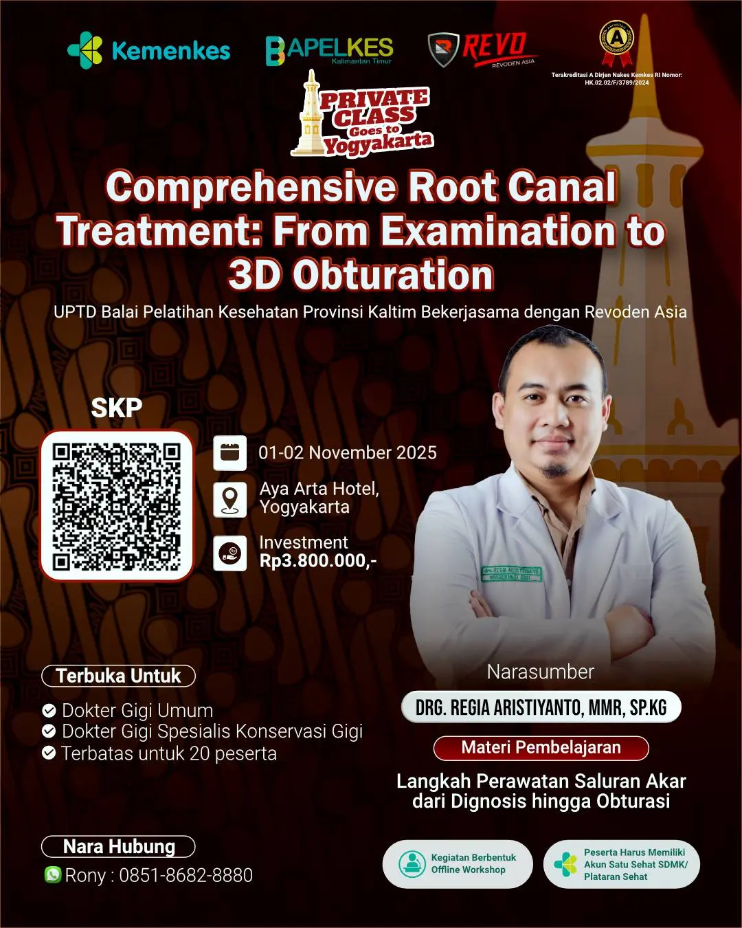 Kegiatan seminar dan pelatihan “Comprehensive Root Canal Treatment: From Examination to 3D Obturation” ini disusun untuk memberikan pemahaman menyeluruh mengenai prinsip dasar dan penerapan klinis dalam perawatan saluran akar. Program ini mengintegrasikan sesi teori dan praktik langsung, sehingga peserta tidak hanya mendapatkan wawasan konseptual tetapi juga pengalaman aplikatif yang relevan