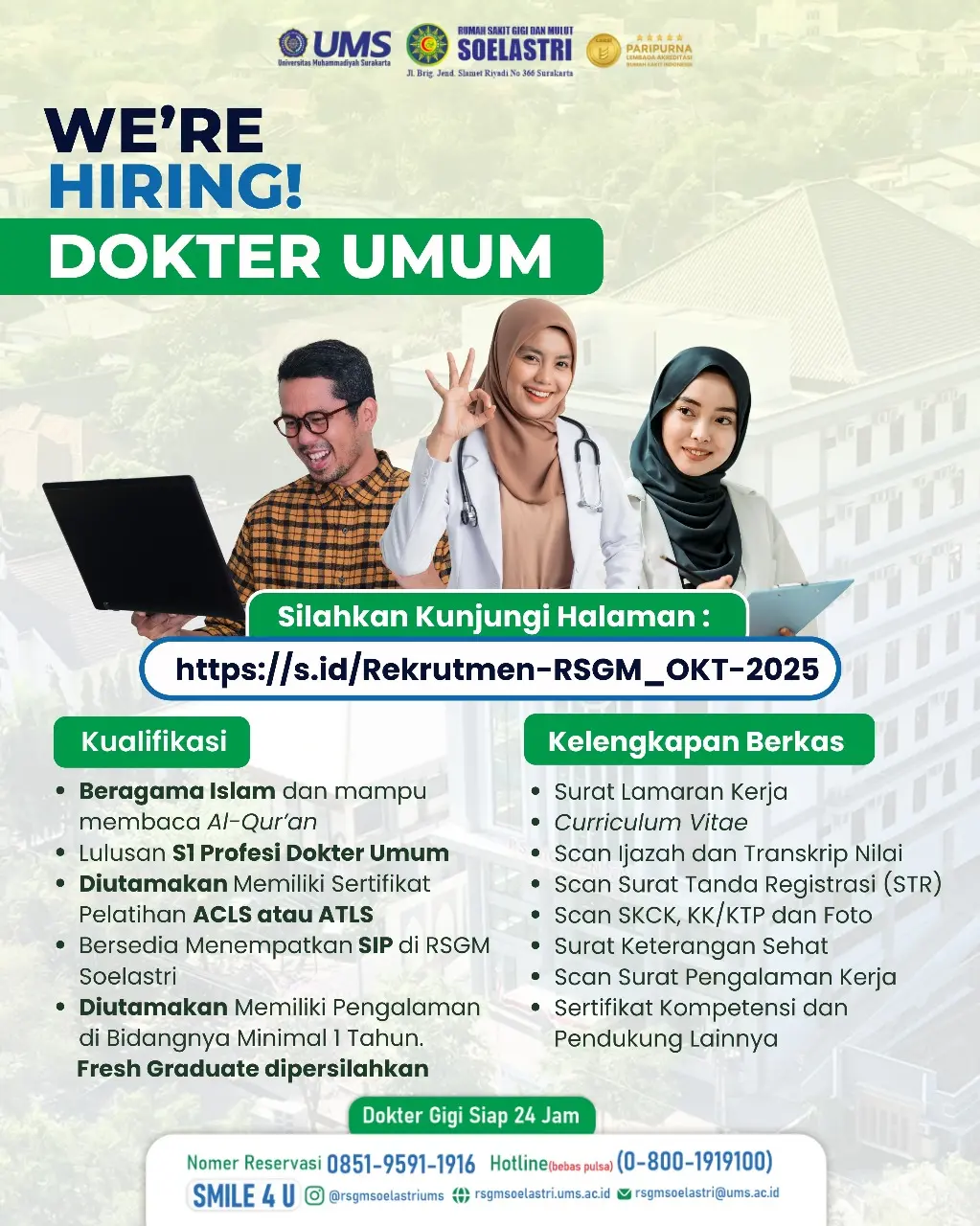 Dibutuhkan Dokter UmumĀ untuk penempatan di RS Gigi dan Mulut Soelastri UMS Surakarta . Untuk lamaran silahkan kirim melalui link yang tertera.