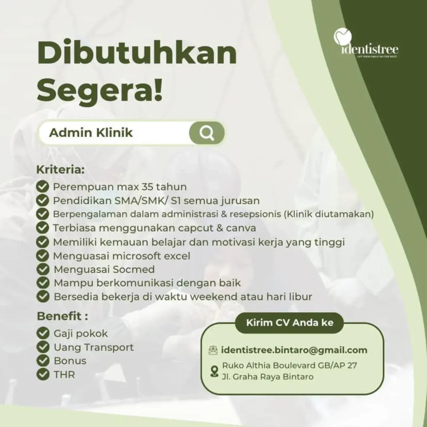 Dibutuhkan Admin Klinik Gigi untuk penempatan di Identistree Klinik Gigi Bintaro. Untuk lamaran silahkan kirim melalui email yang tertera.