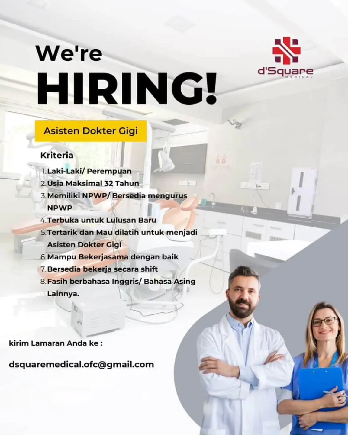 Dibutuhkan Asisten Dokter GigiĀ untuk penempatan di d'Square Medical Centre Kuta, Bali. Untuk lamaran silahkan kirim melalui email yang tertera.
