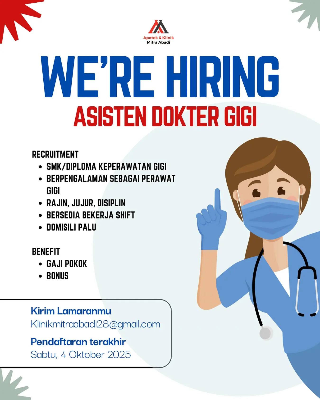 Dibutuhkan Asisten Dokter GigiĀ untuk penempatan di Apotek & Klinik Mitra Abadi Palu. Untuk lamaran silahkan kirim melalui email yang tertera.