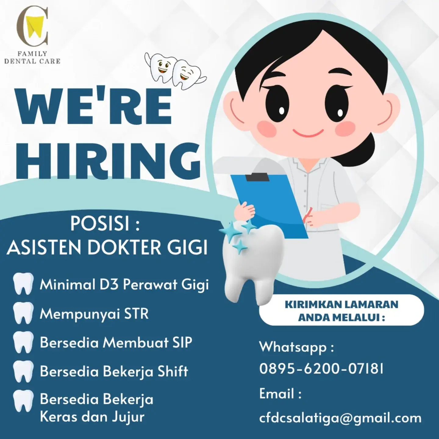 Dibutuhkan Asisten Dokter Gigi untuk penempatan di C Family Dental Care Salatiga. Untuk lamaran silahkan kirim melalui email yang tertera.