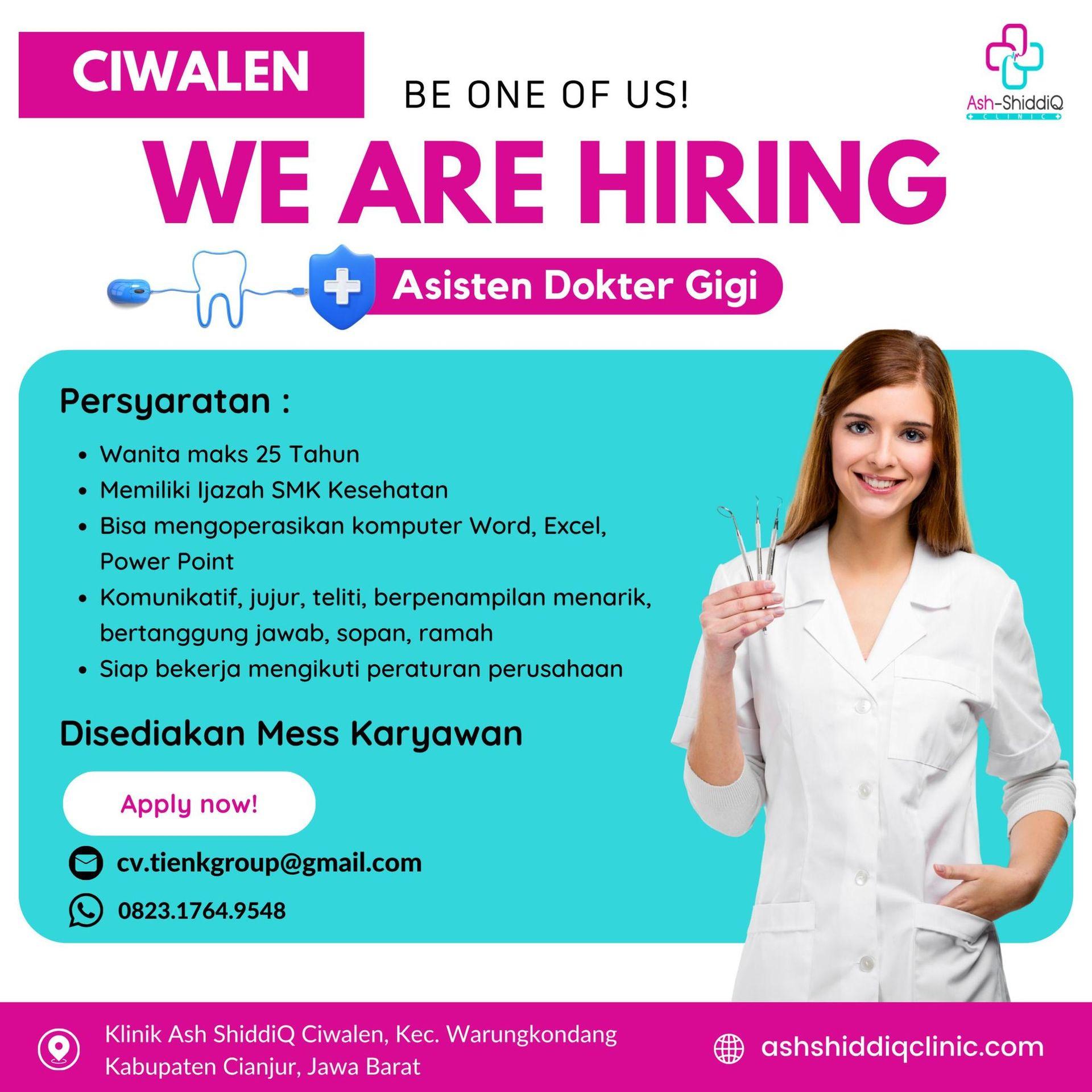 Dibutuhkan Asisten Dokter Gigi untuk penempatan di Klinik Ash-ShiddiQ. Untuk lamaran silahkan kirim melalui email yang tertera.