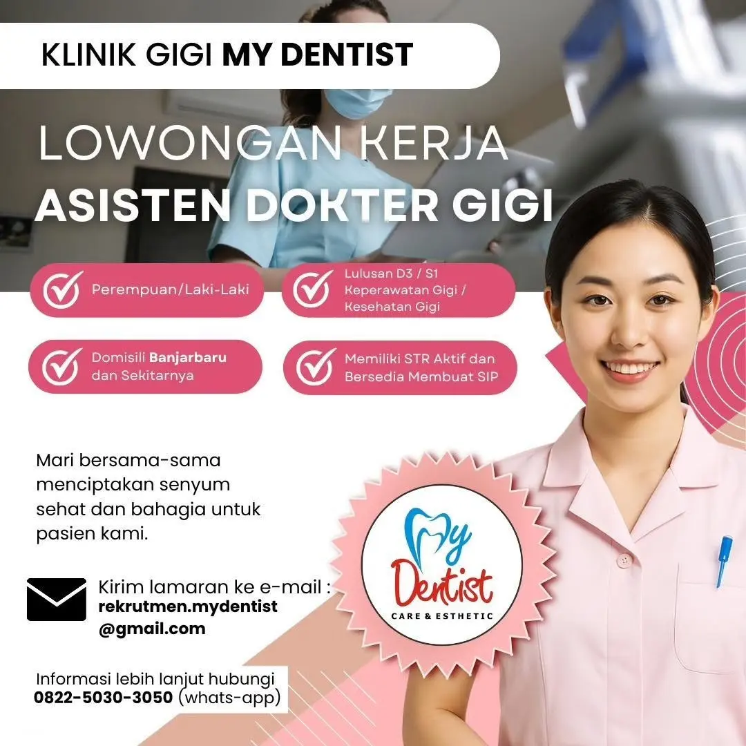 Dibutuhkan Asisten Dokter Gigi untuk penempatan di Klinik Gigi My Dentist Banjarbaru. Untuk lamaran silahkan kirim melalui email yang tertera.