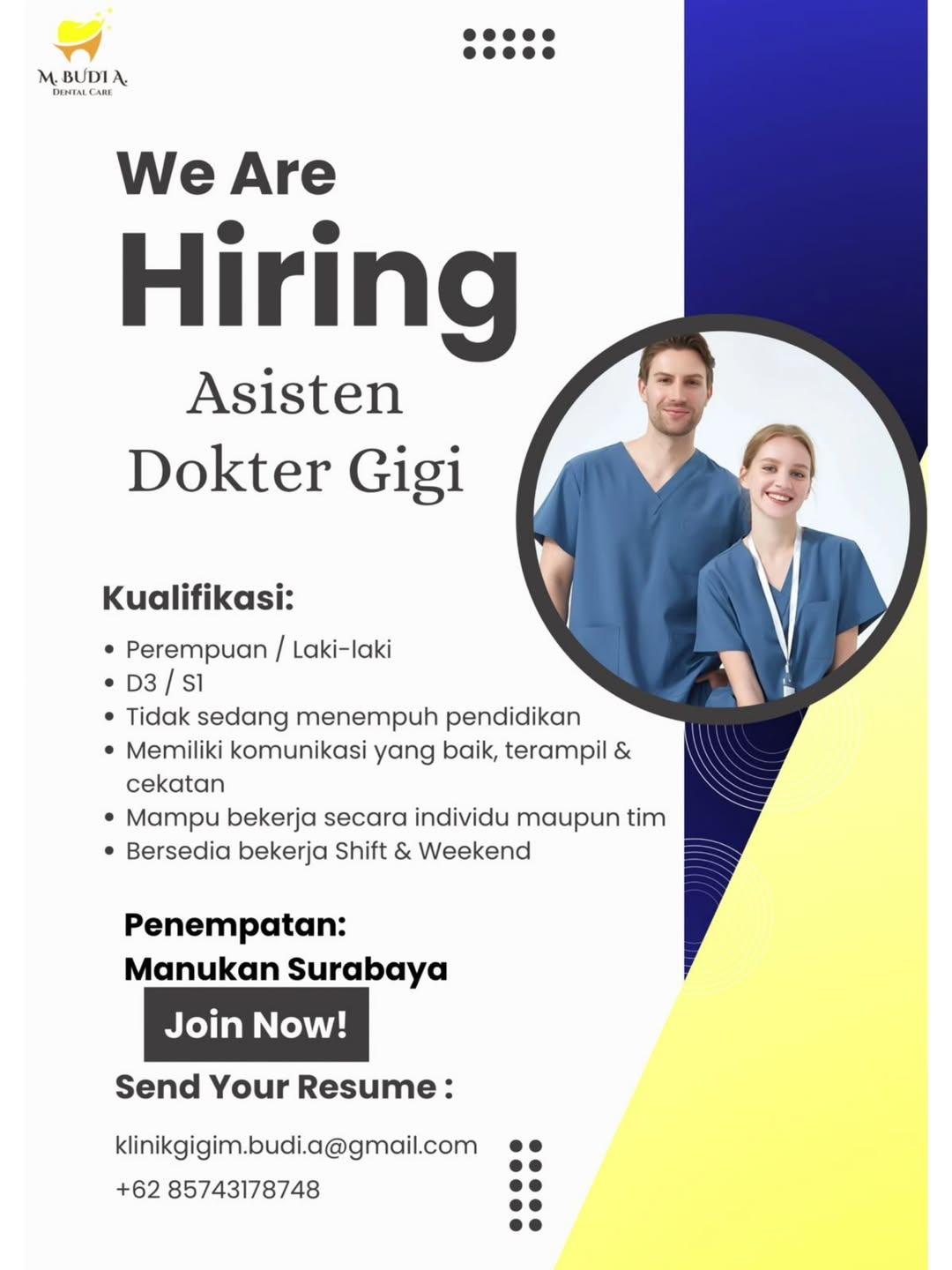 Dibutuhkan Asisten Dokter Gigi untuk penempatan di M. Budi A. Dental Care Surabaya. Untuk lamaran silahkan kirim melalui email atau nomor yang tertera.