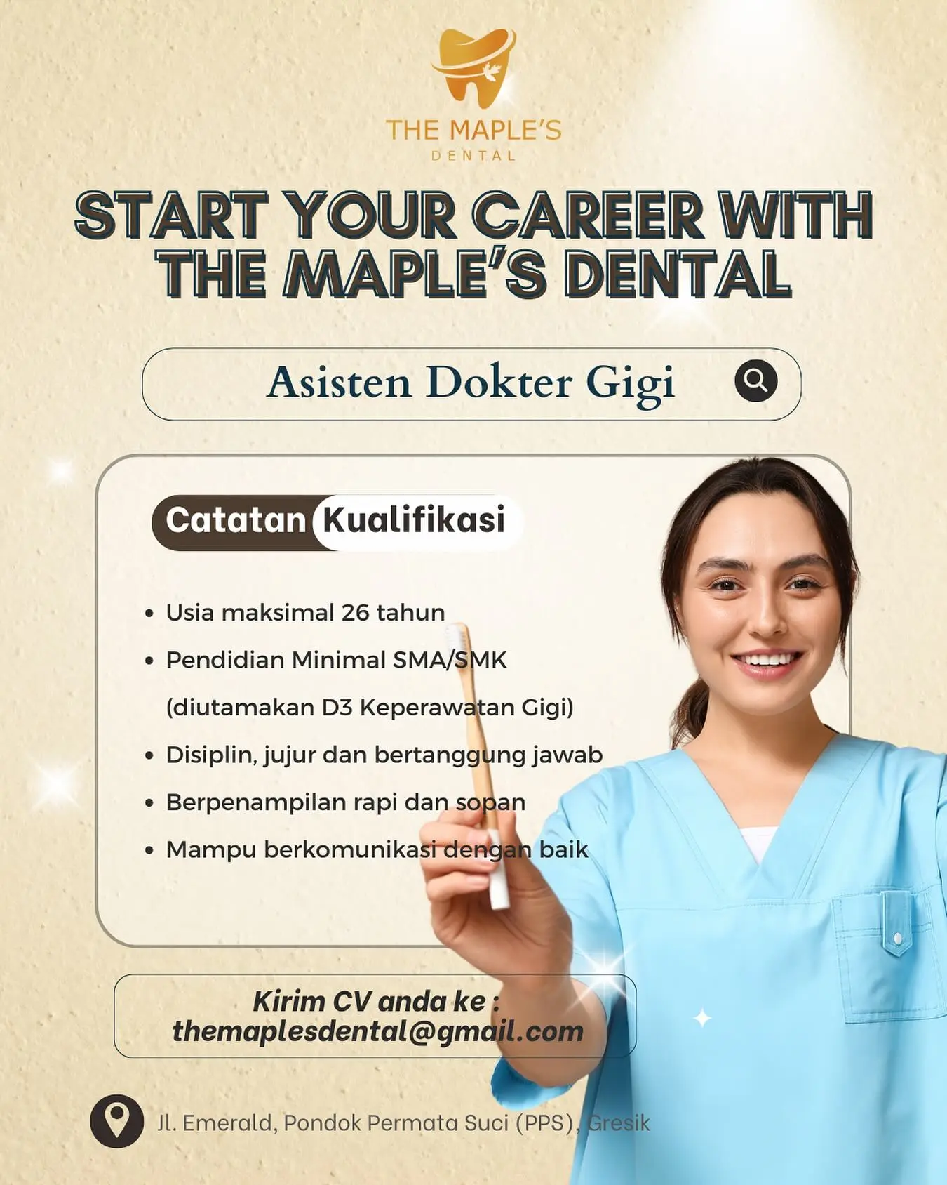 Dibutuhkan Asisten Dokter Gigi untuk penempatan di The Maple’s Dental Gresik. Untuk lamaran silahkan kirim melalui email yang tertera.