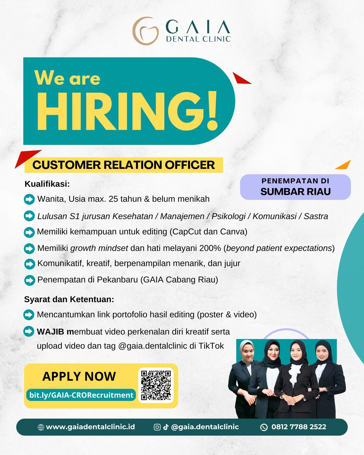 Dibutuhkan Customer Relation Officer untuk penempatan di GAIA Dental Clinic Riau. Untuk lamaran silahkan kirim melalui barcode yang tertera.