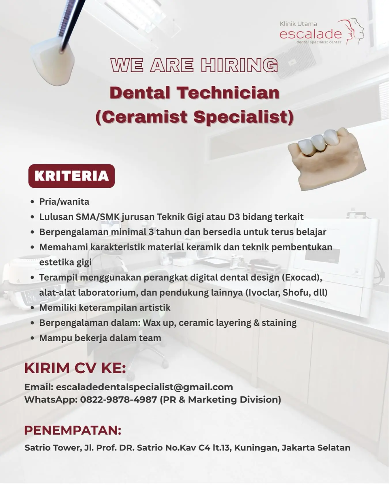 Dibutuhkan Dental Technician (Ceramist Specialist) untuk penempatan di Escalade Dental Specialist Center Jakarta Selatan. Untuk lamaran silahkan kirim melalui email yang tertera.