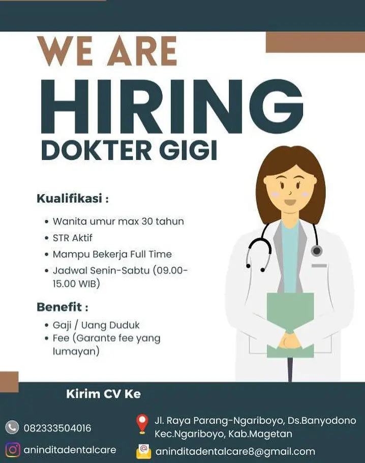 Dibutuhkan Dokter GigiĀ untuk penempatan di Anindita Dental Care, Magetan. Untuk lamaran silahkan kirim melalui email yang tertera.