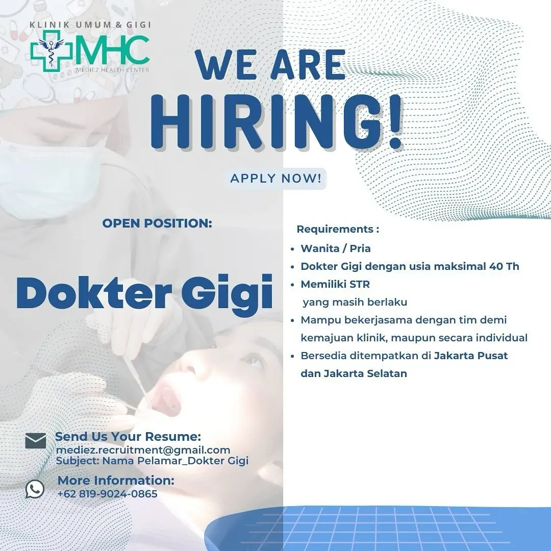 Dibutuhkan Dokter GigiĀ untuk penempatan di Klinik Pratama Mediez Health Center Jakarta Pusat dan Jakarta Selatan. Untuk lamaran silahkan kirim melalui email yang tertera.