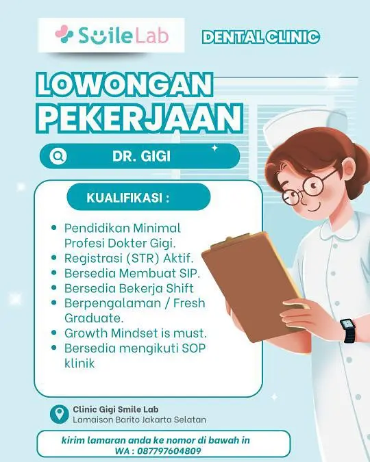 Dibutuhkan Dokter GigiĀ untuk penempatan di Clinic Gigi Smile Lab Jakarta Selatan. Untuk lamaran silahkan kirim melalui nomor whatsapp yang tertera.