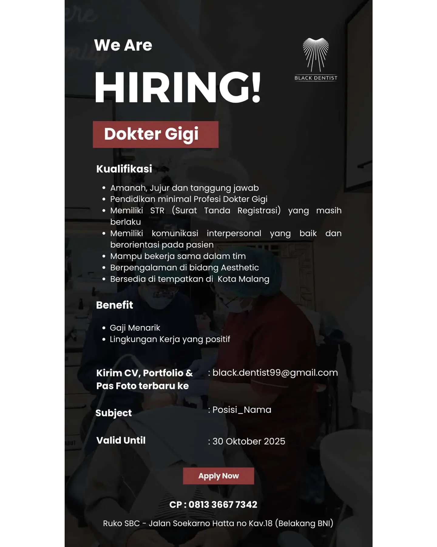 Dibutuhkan Dokter GigiĀ untuk penempatan di Black Dentist Dental Care Malang. Untuk lamaran silahkan kirim melalui nomor whatsapp yang tertera.