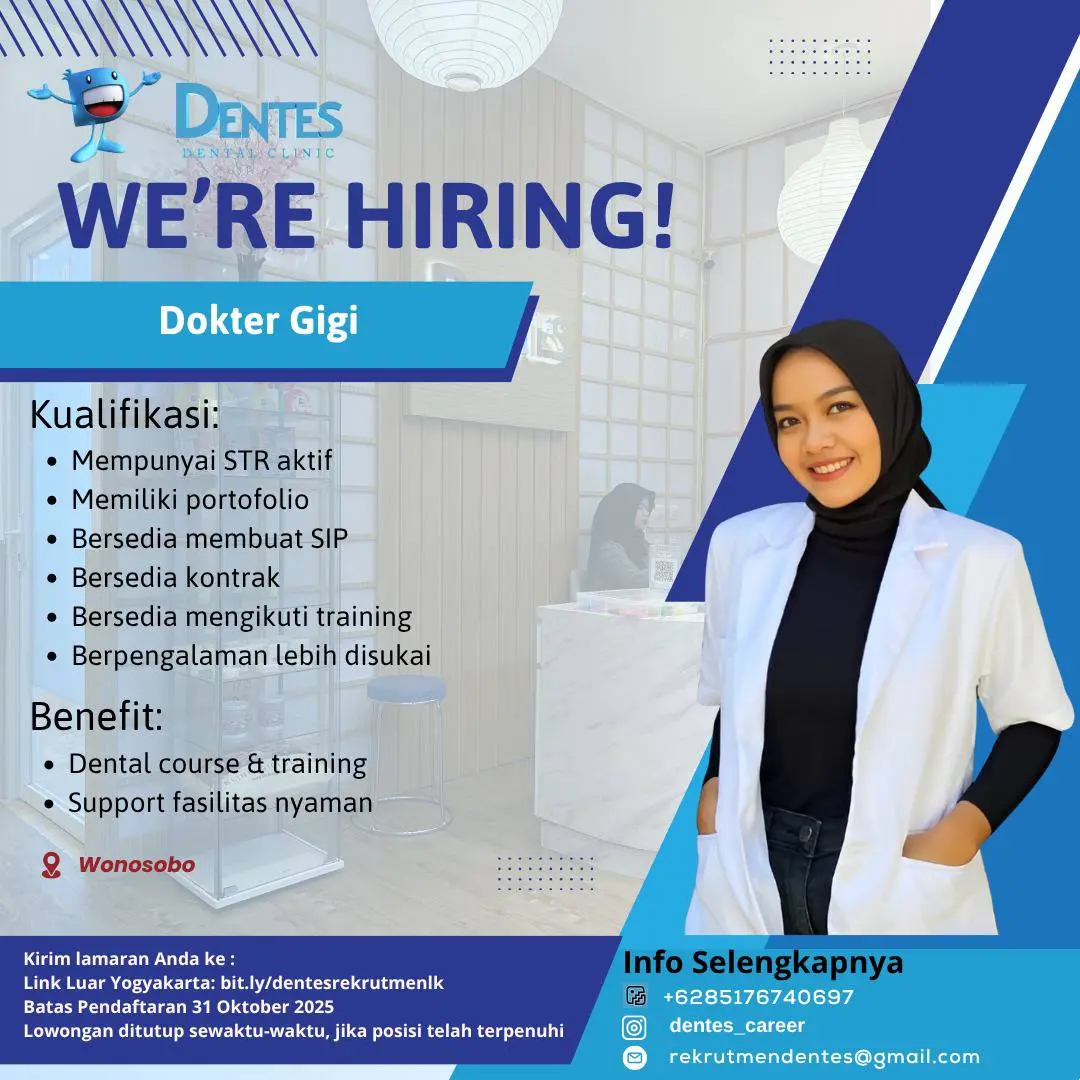 Dibutuhkan Dokter Gigi untuk penempatan di Klinik Gigi Dentes Wonosobo. Untuk lamaran silahkan kirim melalui email atau link yang tertera.
