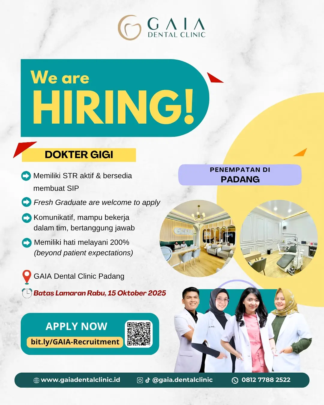 Dibutuhkan Dokter GigiĀ untuk penempatan di GAIA Dental Clinic Padang. Untuk lamaran silahkan kirim melalui link yang tertera.