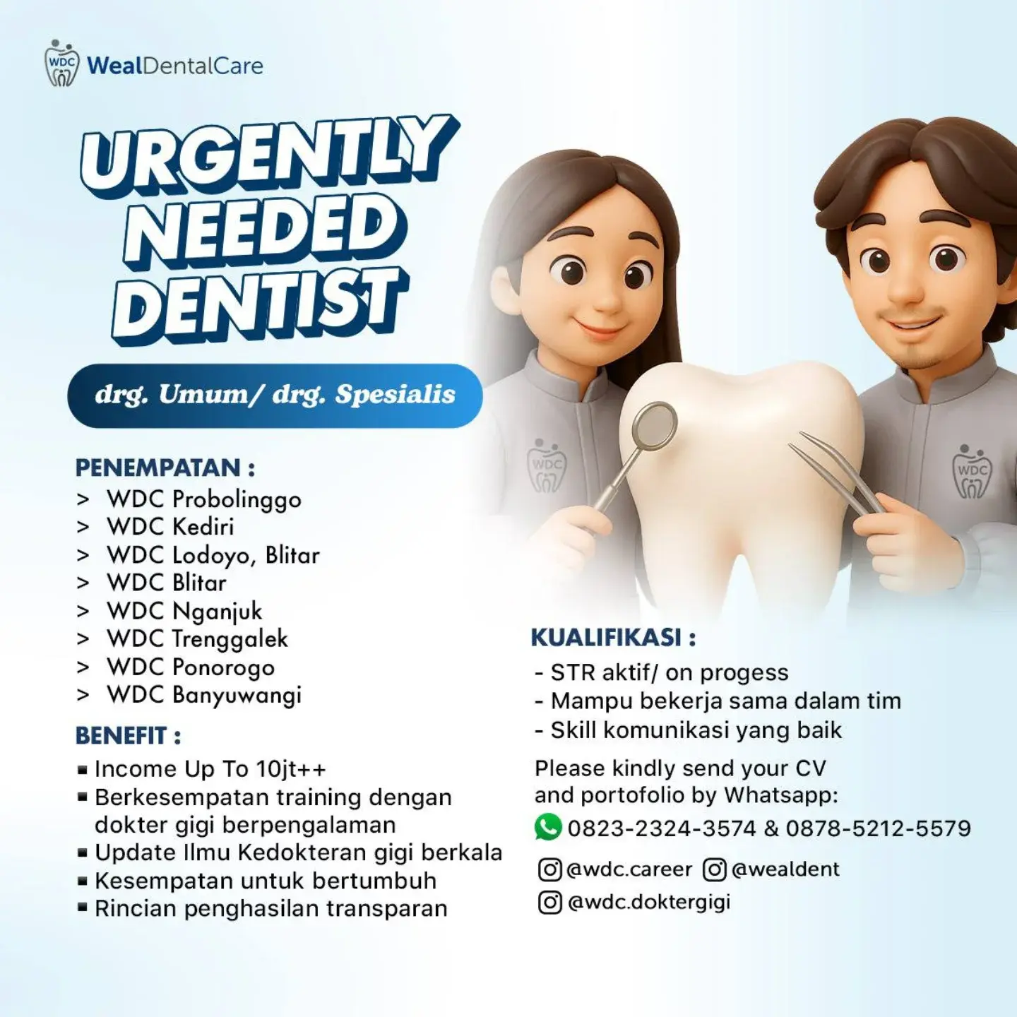 Dibutuhkan Dokter GigiĀ untuk penempatan di Weal Dental Care . Untuk lamaran silahkan kirim melalui nomor whatsapp yang tertera.