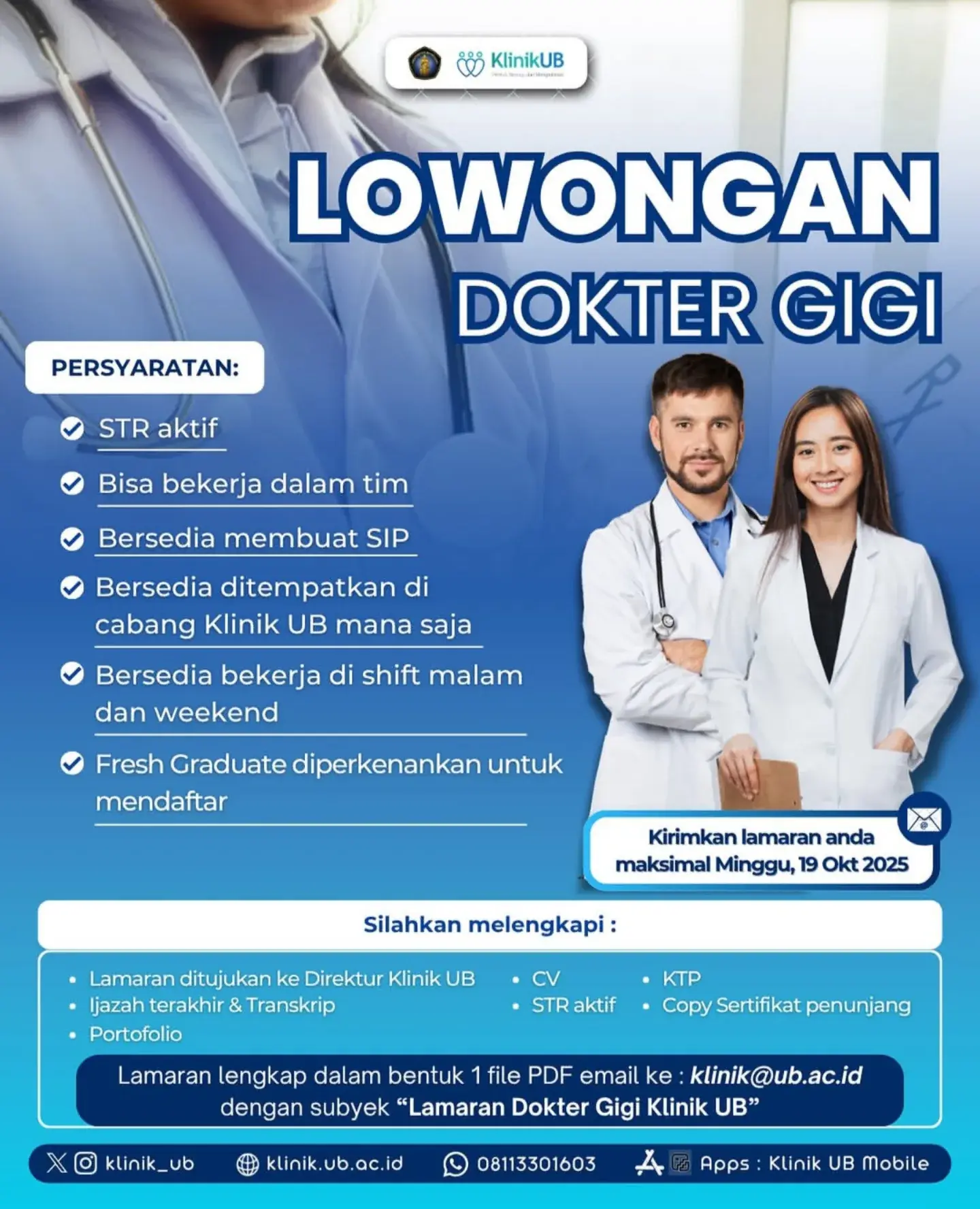 Dibutuhkan Dokter Gigi untuk penempatan di Klinik Universitas Brawijaya. Untuk lamaran silahkan kirim melalui email yang tertera.