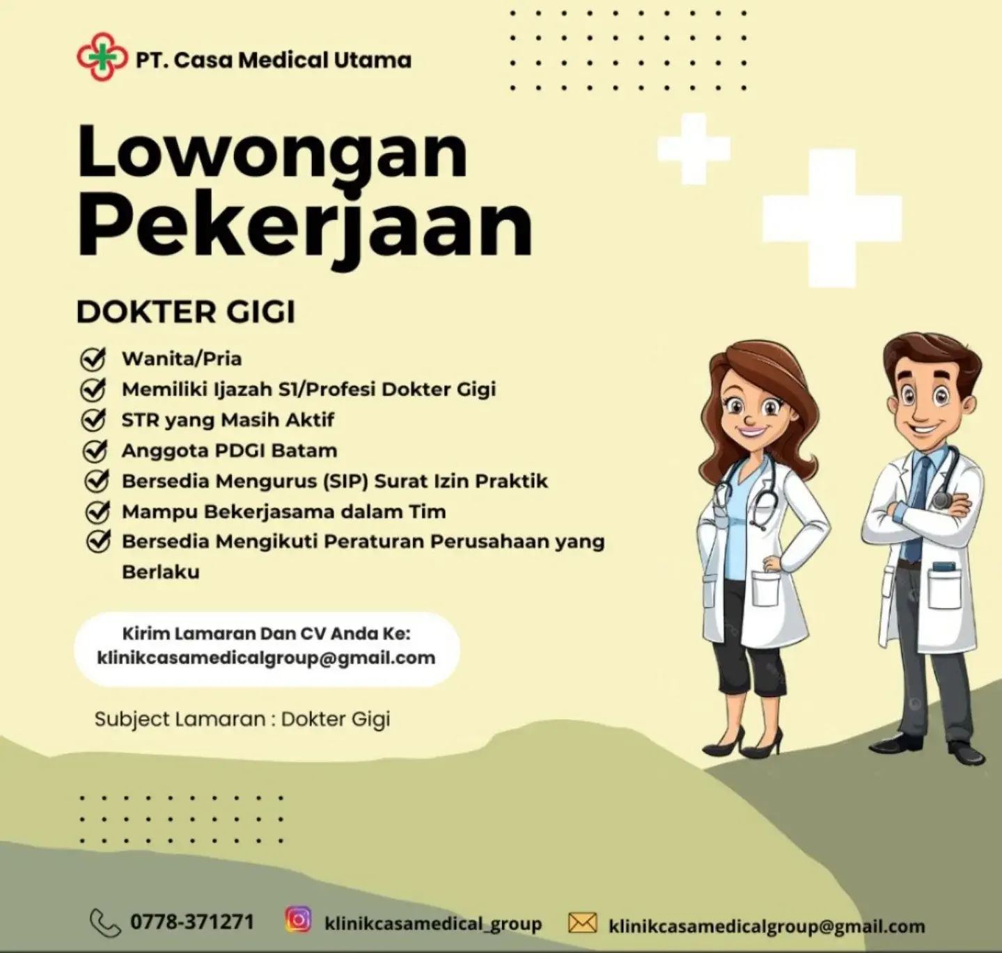 Dibutuhkan DokterĀ GigiĀ untuk penempatan di Klinik Casa Medical Group Batam. Untuk lamaran silahkan kirim melalui email yang tertera.