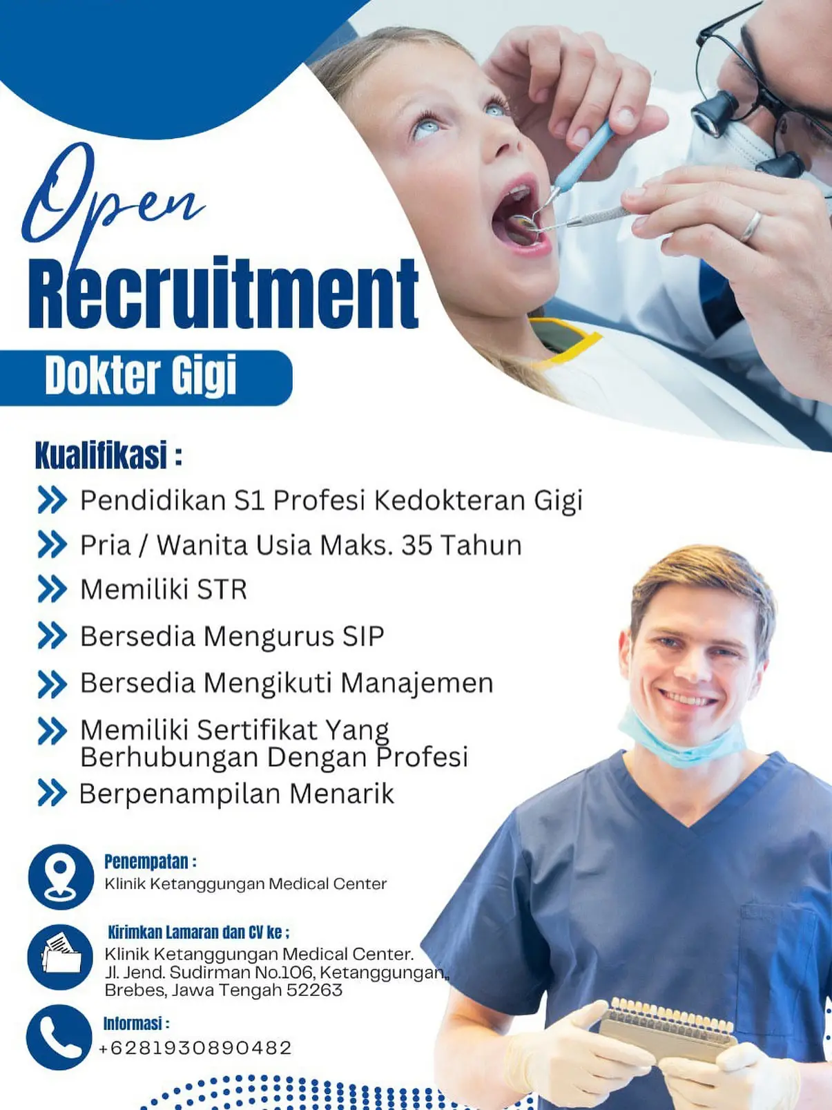 Dibutuhkan DokterĀ GigiĀ untuk penempatan di Klinik KMC (Ketanggungan Medical Center). Untuk lamaran silahkan kirim melalui alamat lokasi yang tertera.