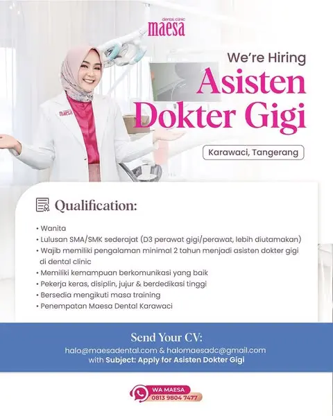 Dibutuhkan Dokter Gigi untuk penempatan di Maesa Dental Clinic Tangerang. Untuk lamaran silahkan kirim melalui email yang tertera.