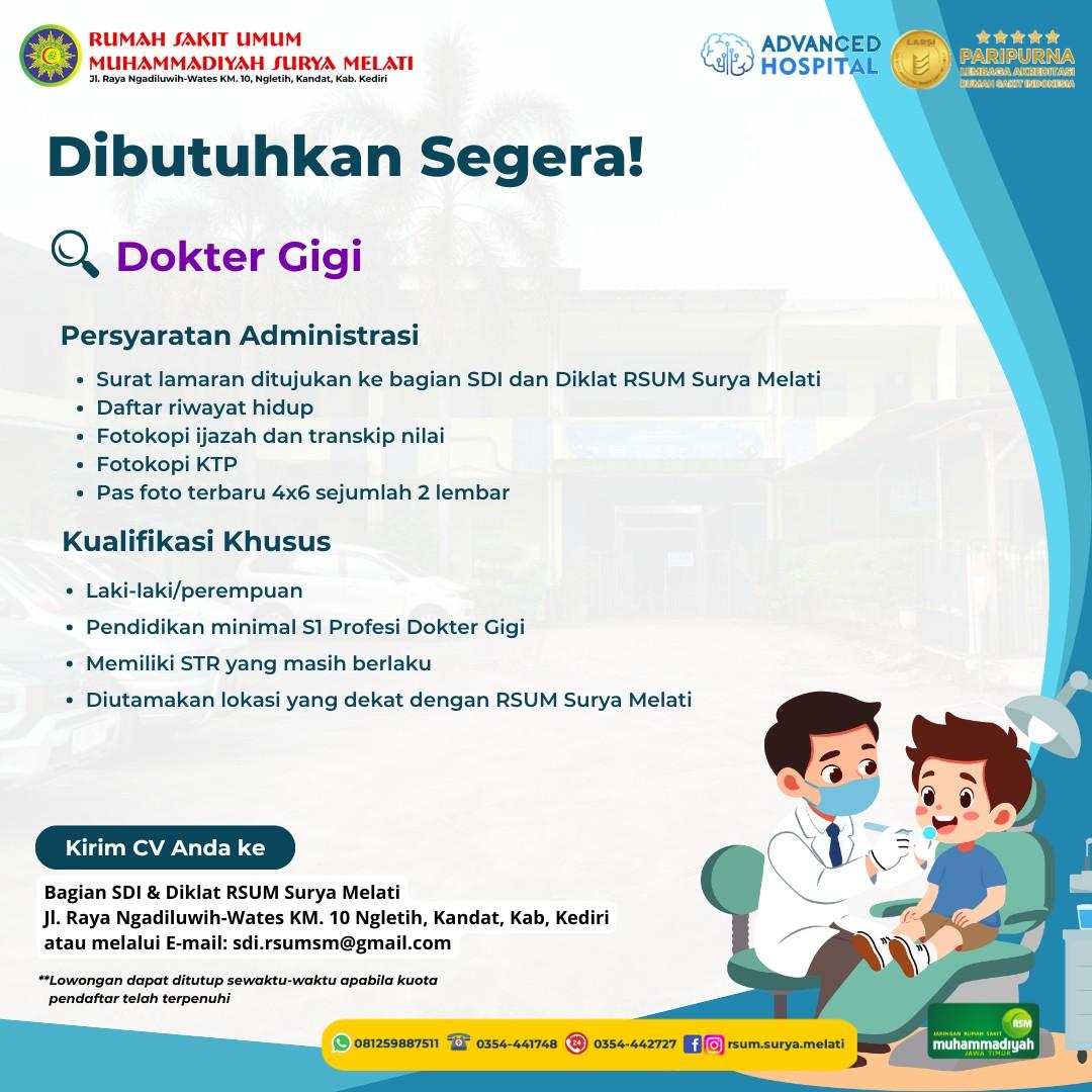 Dibutuhkan Dokter Gigi untuk penempatan di RSUM Surya Melati Kediri. Untuk lamaran silahkan kirim melalui email yang tertera.
