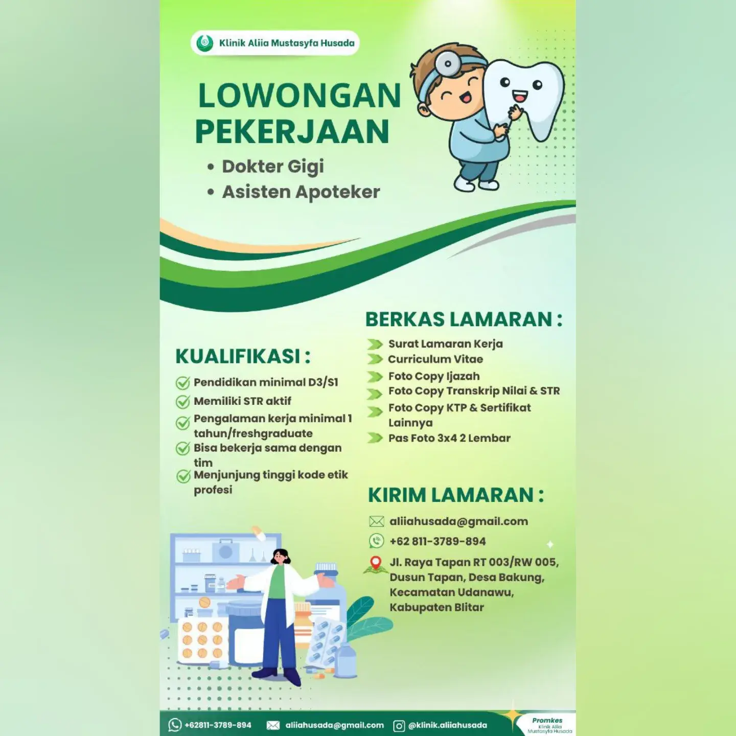 Dibutuhkan Dokter Gigi untuk penempatan di Klinik Aliia Mustasyfa Husada Blitar. Untuk lamaran silahkan kirim melalui email yang tertera.