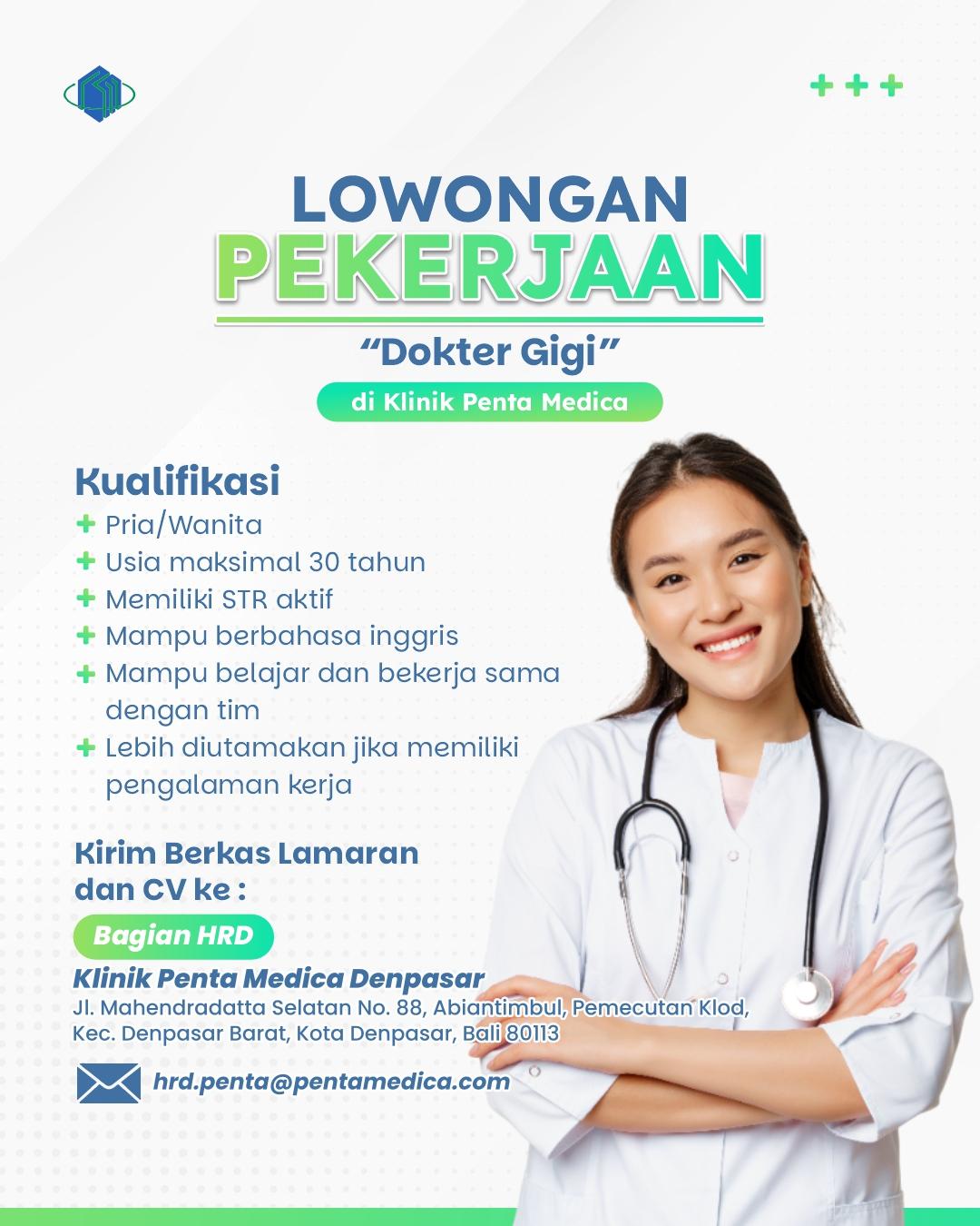 Dibutuhkan Dokter Gigi untuk penempatan di Klinik Penta Medica Denpasar. Untuk lamaran silahkan kirim melalui email yang tertera.